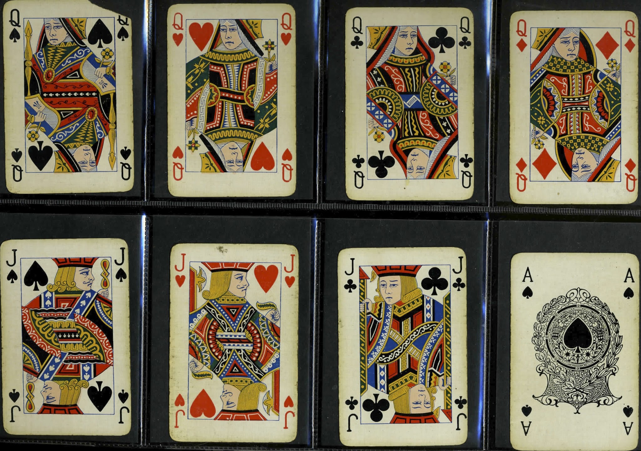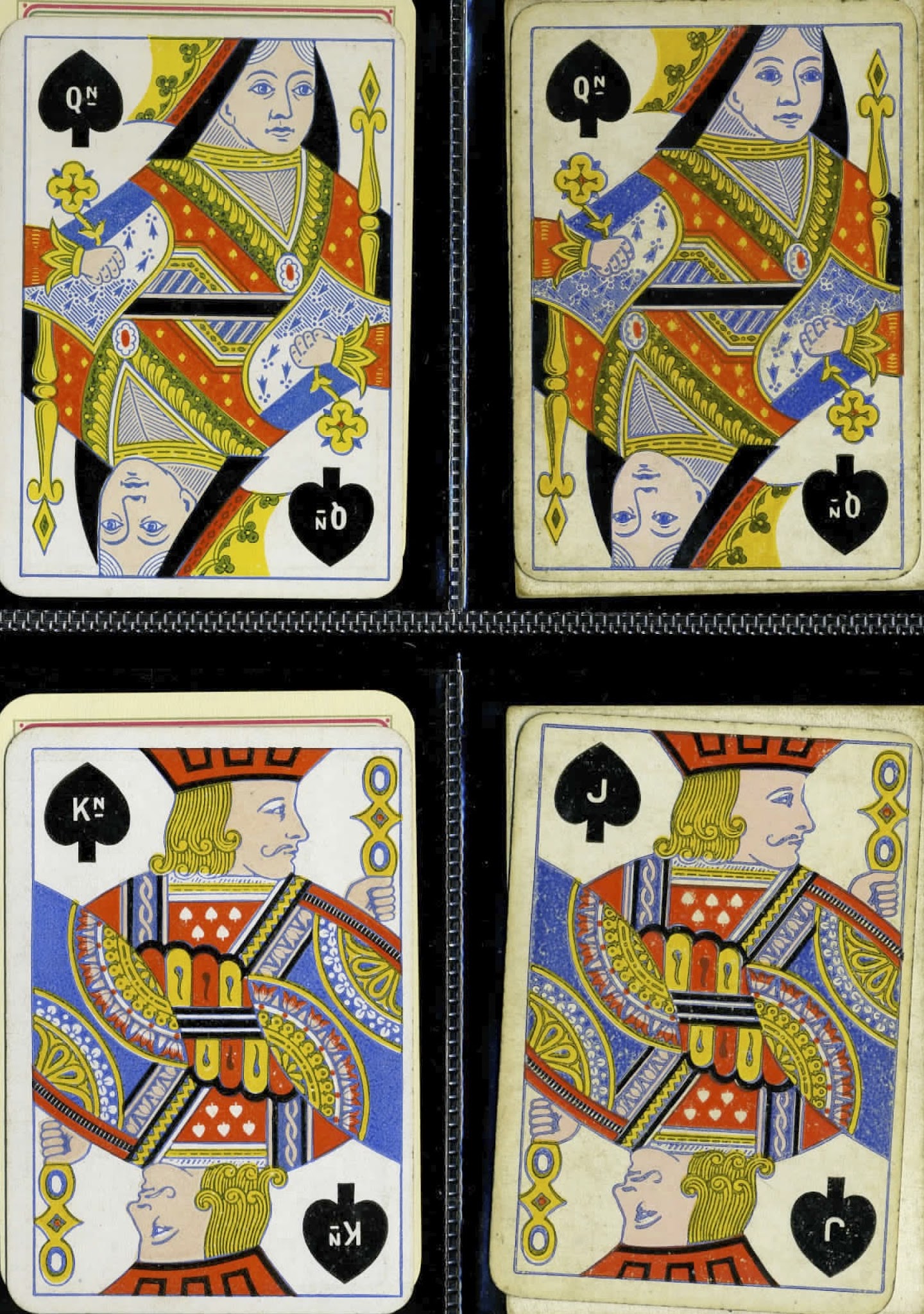 On the other hand, Hardy, Bancks, Reynolds and De La Rue opted for the redrawing of the figures, which involved incorporating the two ends into one overall design. In some cases this has meant that one of the court's hands has disappeared, or a piece of the lower clothing has been moved higher up, such as the back of the QS's skirt shifting to under her arm, as in the Hardy, Reynolds and De La Rue packs (though not illustrated in the last one).