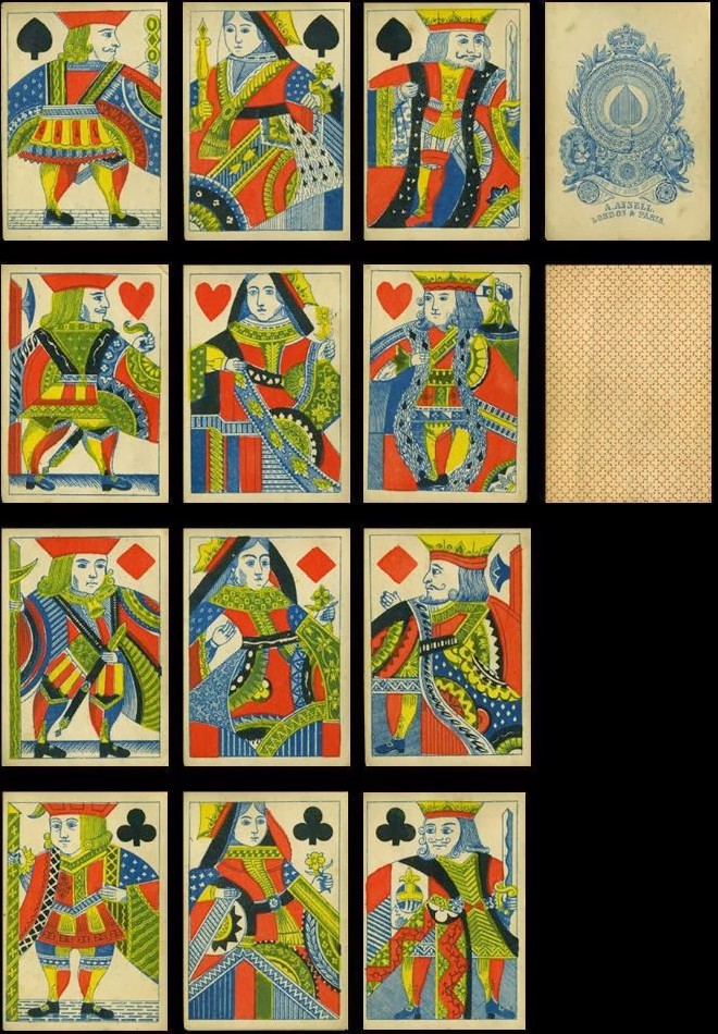 A. Ansell & Co appear first in 1831, but disappear from time to time after 1846, though the firm is still listed as a merchant in the 1870s and as late as 1884. This seems to be the same firm, as the first name is still Abraham. Ansell’s cards are those of Van Genechten: the AS is the latter’s design with Ansell’s name (“London & Paris”) written at the base. Van Genechten only started his business on his own (without Glénisson) in 1856, so whether Ansell became an agent for the Turnhout manufacturer is not clear. Ansell used a number of different court sets.