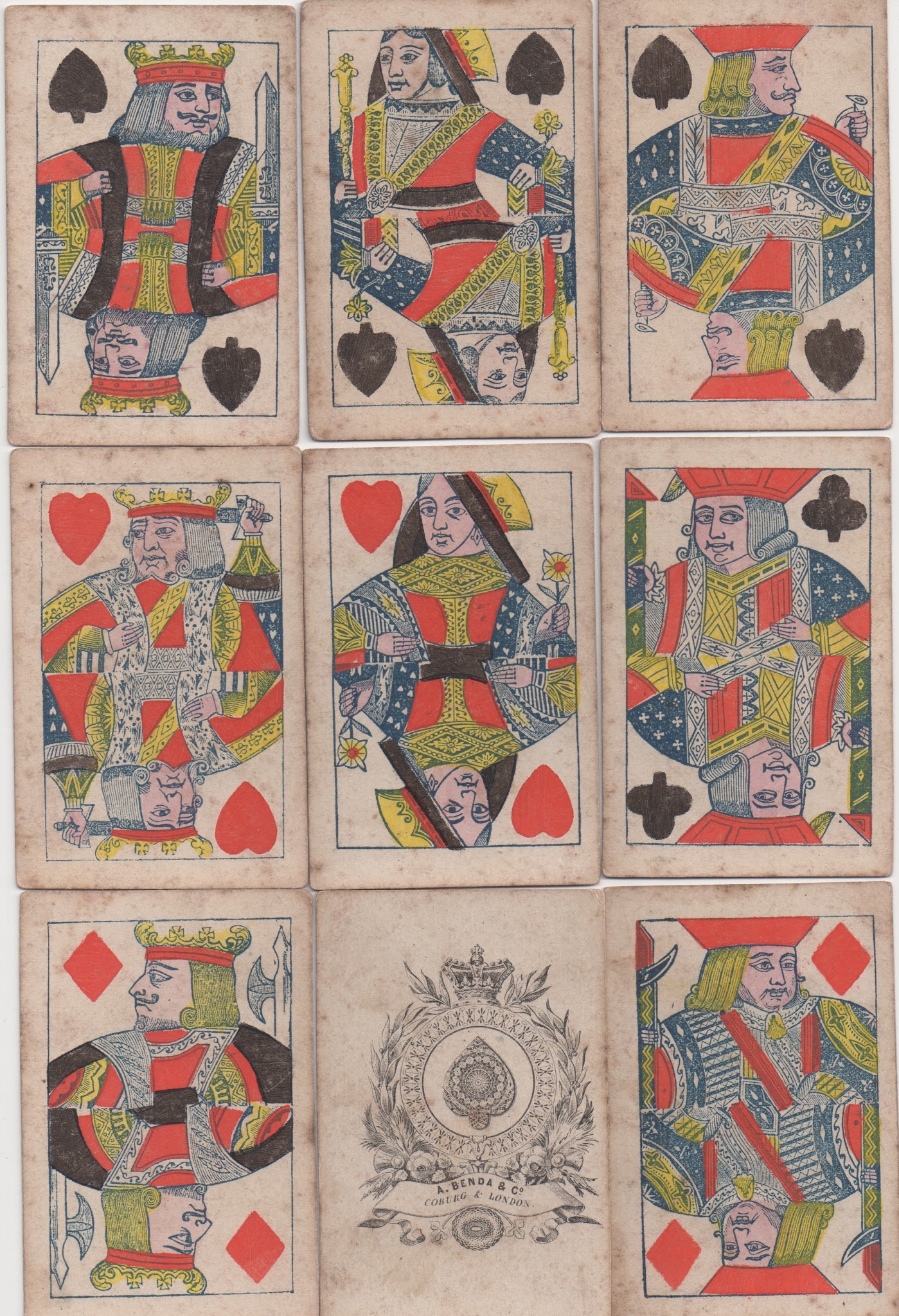 However, the courts with the A. Benda aces are BW2 (see page 36 on Whitaker), which were probably produced by Van Genechten. So this one is complicated! But G. Benda also had cards with the Van Genechten AS used by Ansell (bottom right above) with his name at the base and with single-figure courts like those of Davis (see below). There is a pack by Anton Benda with a double-ended version of BW2 made from the top half of the plate used twice.