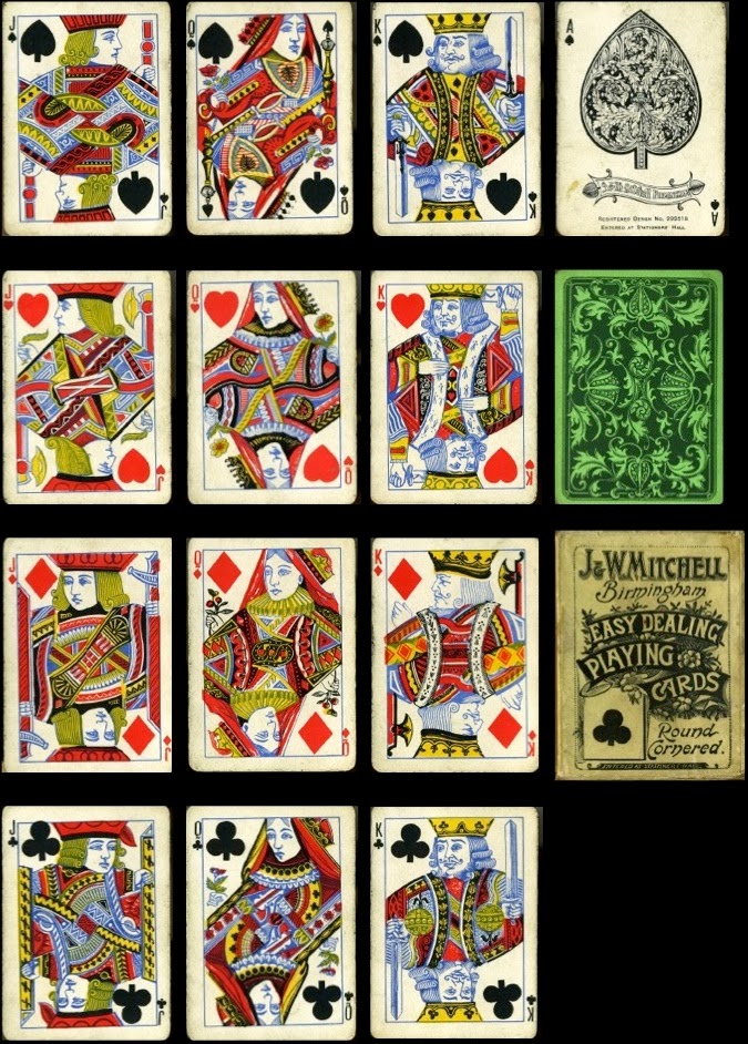 An even smaller outfit in terms of playing card production was J. & W. Mitchell. Based in Birmingham as papermakers, they opened an office in London in 1856. Exactly when they produced their cards is difficult to say, but given that they all have round corners and indices, it must be the 1880s at the earliest.