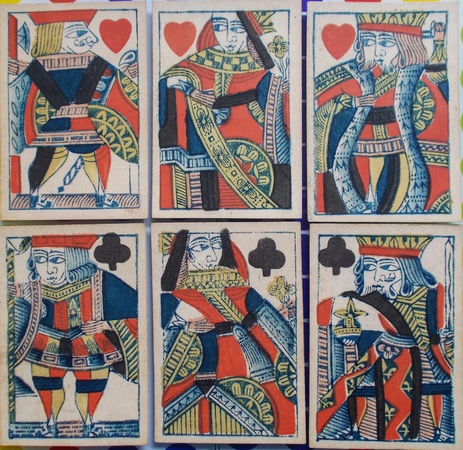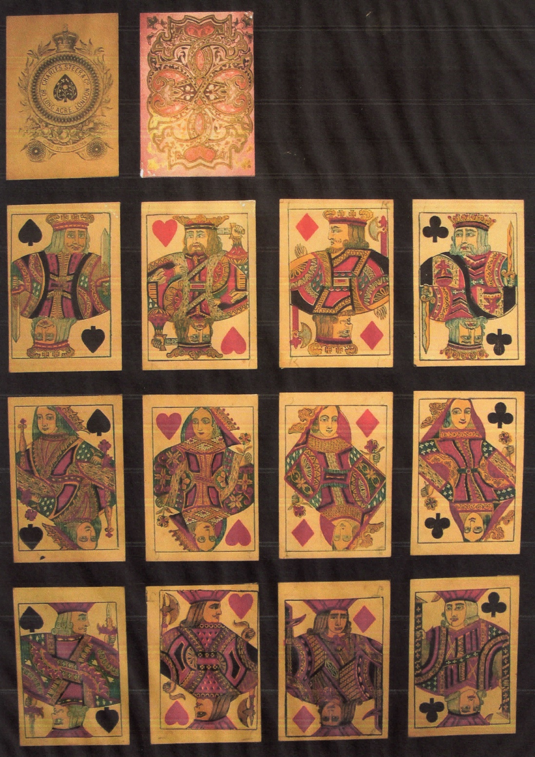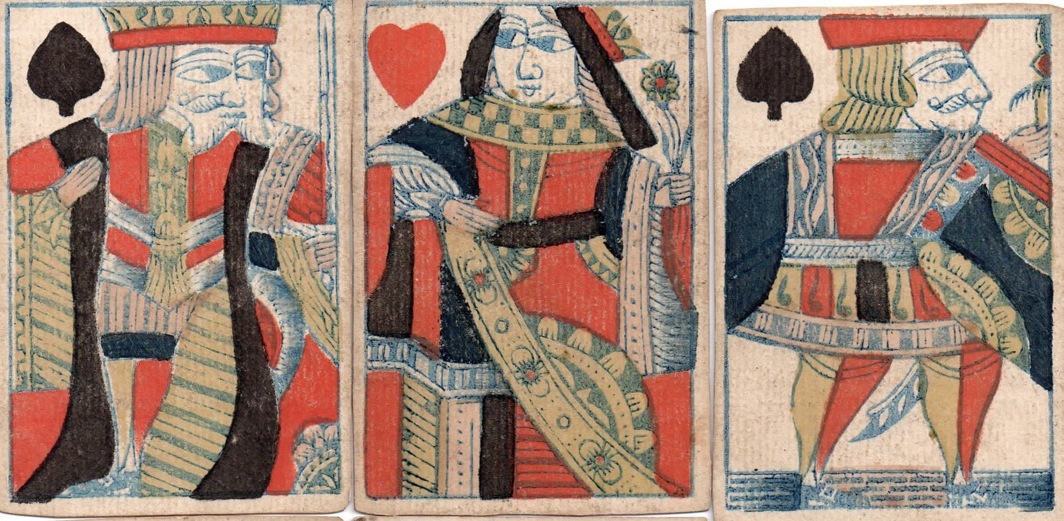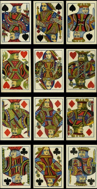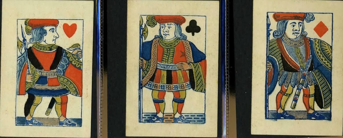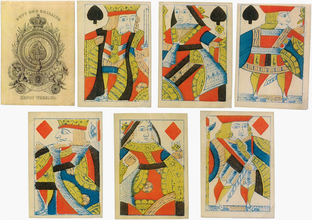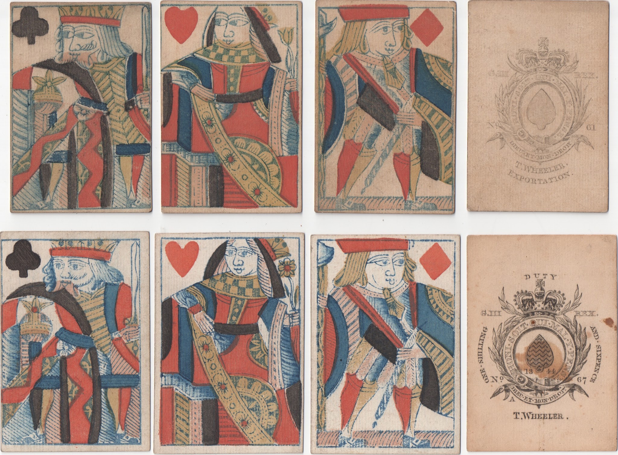 The other version of his single-ended courts is much more like the courts of Lawrence & Cohen and are also found in some Belgian packs. Whether they were made for Whitaker in Belgium after the 1851 fire is difficult to say. (For a set of Lawrence & Cohen courts, see page 13 of this blog.)