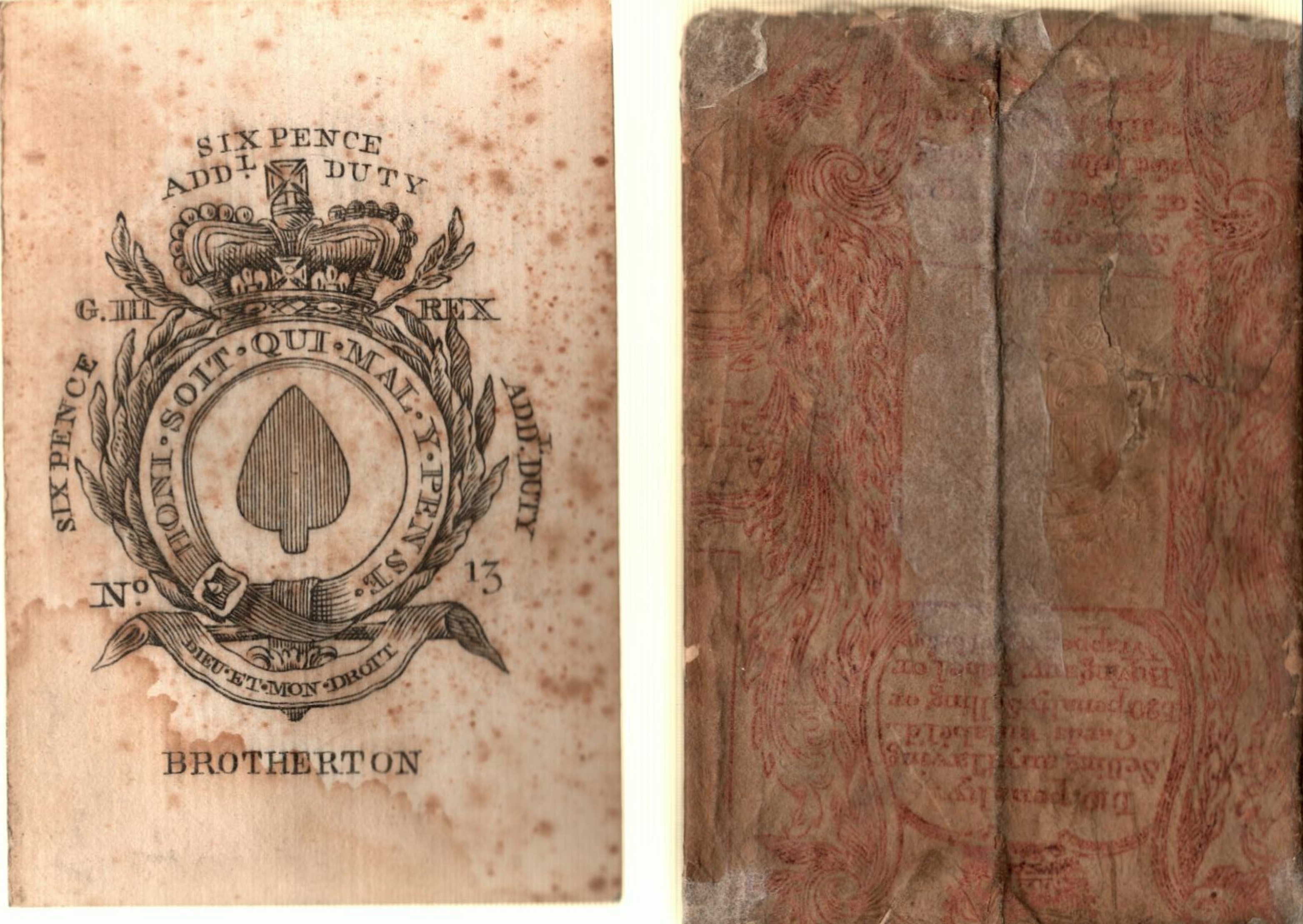 The earliest Brotherton pack I've seen is in the Cuming Museum, London, and dates to c.1792. It has a wrapper with it, too. The courts are an early version of Type I with a black outline.