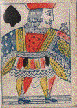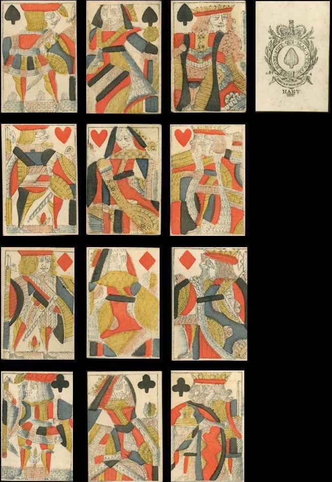 An 18th century maker who disappears for a while and then comes back (presumably the same man), only to go bankrupt in 1799. The odd thing about Hart is that a lot of packs appear with his ASs, even in the United States, so maybe his surplus aces were distributed (or sold illegally after he finished trading) all over the place. Many of the Hart packs on the plainbacks website do not seem to be genuine. Here is a genuine one, though, from c.1768 (A25).