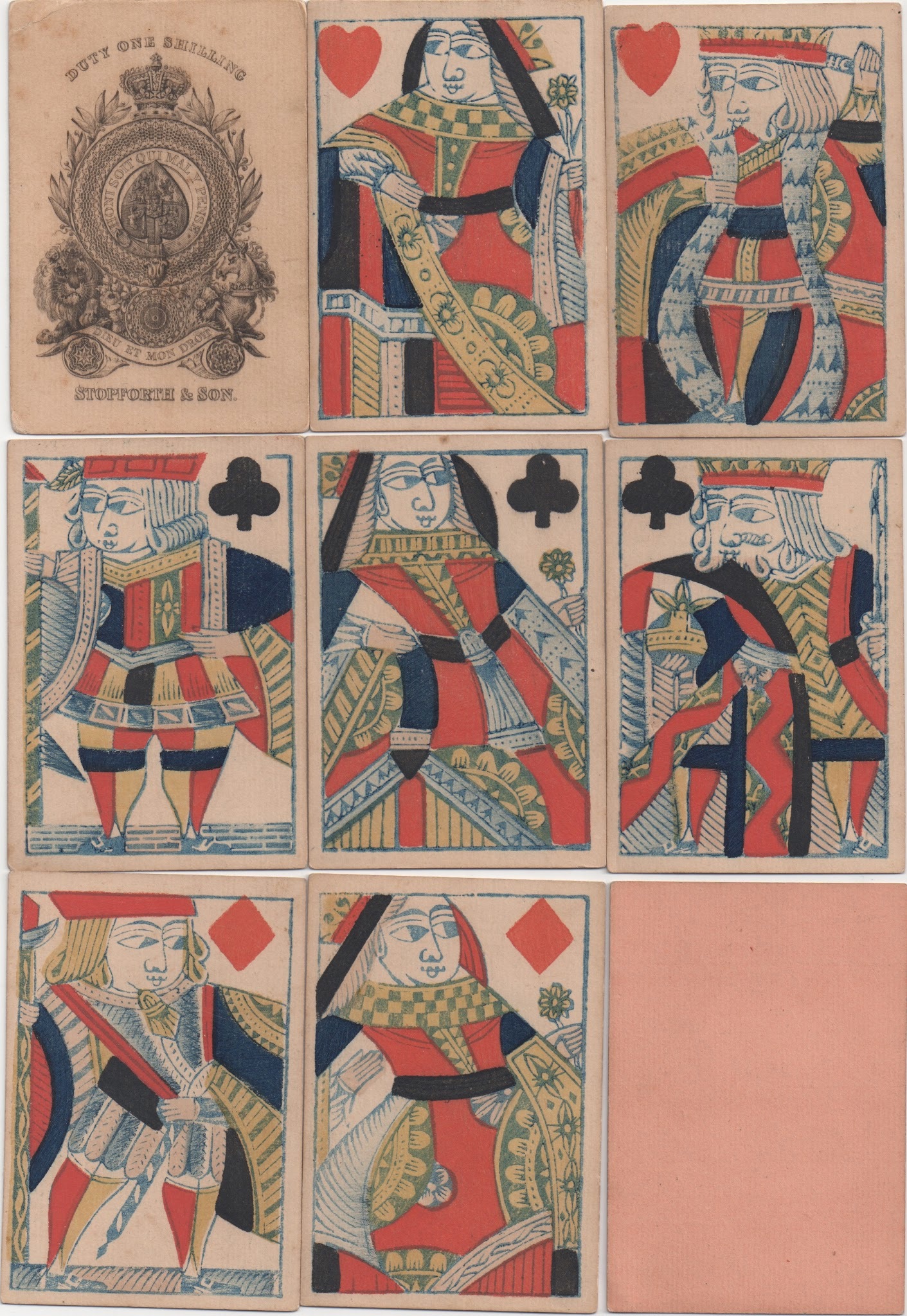 1801 is the date of his first Garter AS; the firm became Stopforth & Son in 1824, and is listed as Ann Stopforth in 1838, after which date the firm disappears. Originally he was foreman to Gibson, and this is specified on some of his early Garter Aces. He used both types of court (I and II), though in the later Old Frizzle period he produced cards with Type III courts as well, like those of Reynolds.