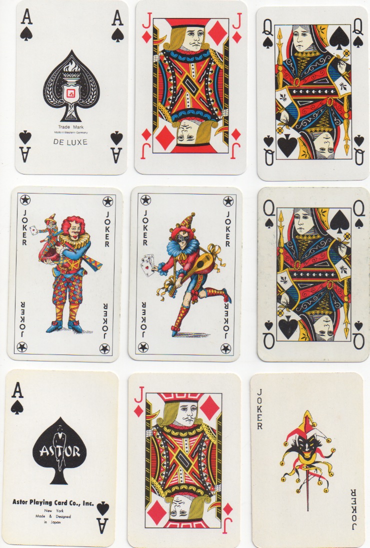 Above: top: standard Nürnberger pack; middle: similar pack with different indices and three different jokers; bottom: the Astor pack