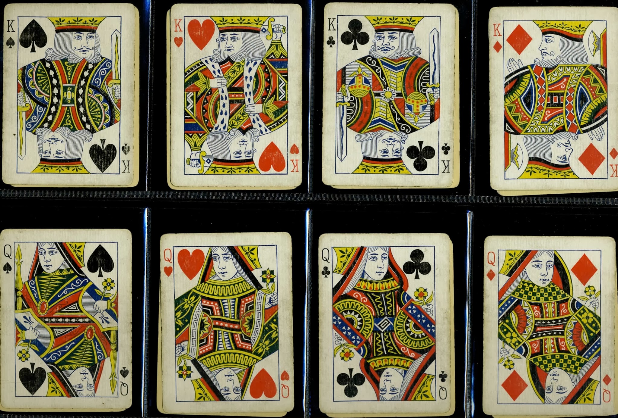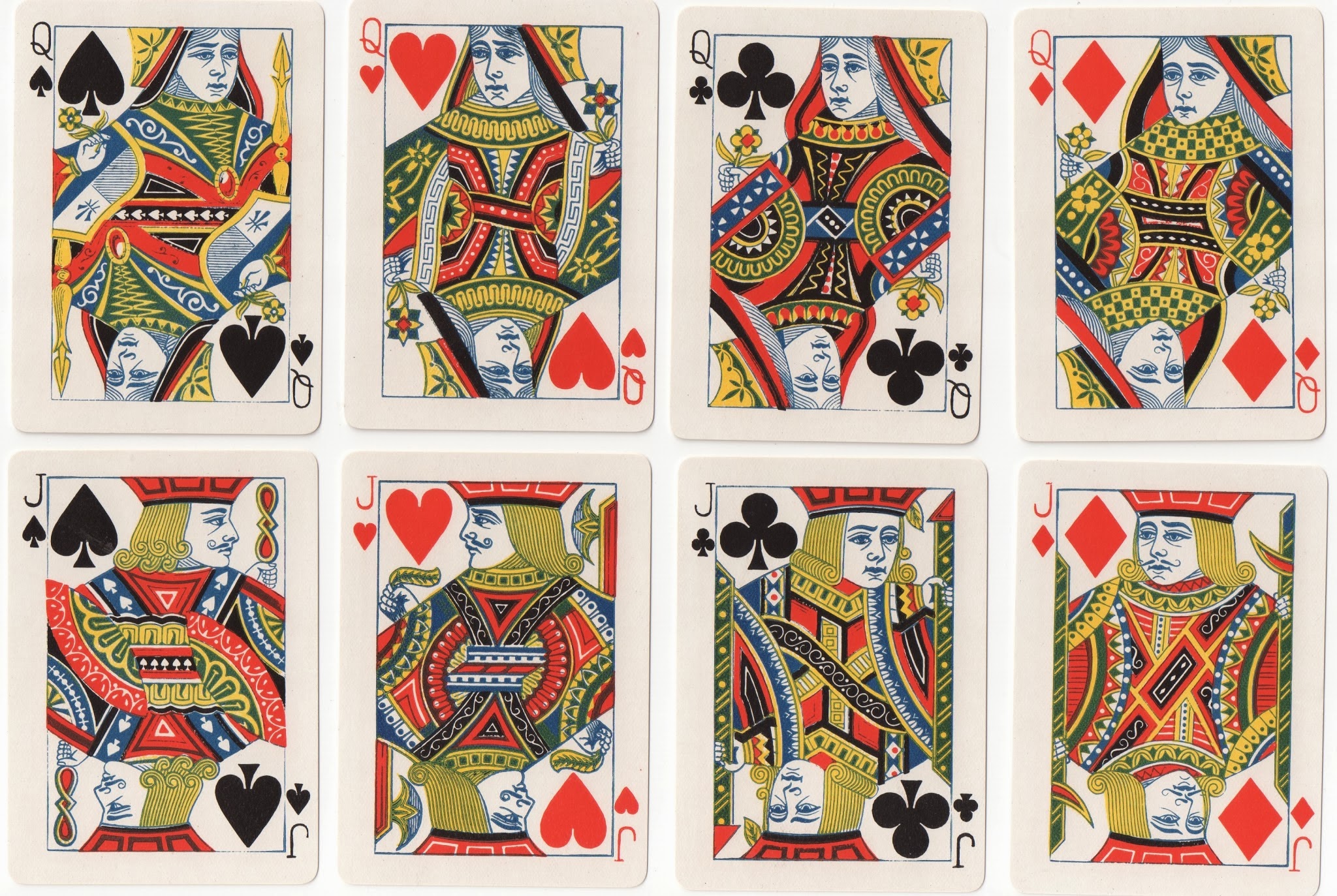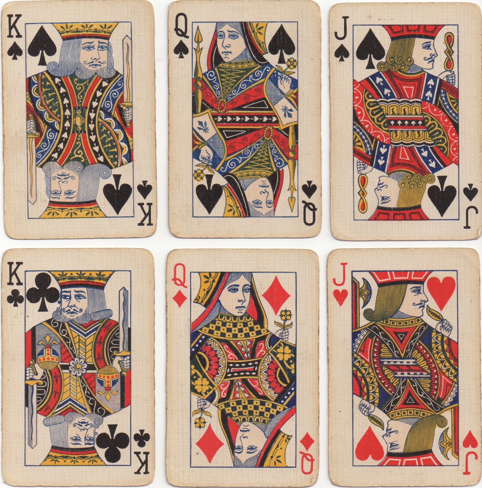 There was also a version, very similar to Piatnik's, by Grimaud. In more recent years, in the late 1950s, Piatnik produced a redrawn version with six turned courts. This was really a transformation of their XUS3, rather than a copy of USPCC's turned version, US4 (note the QS's horizontal arm).
