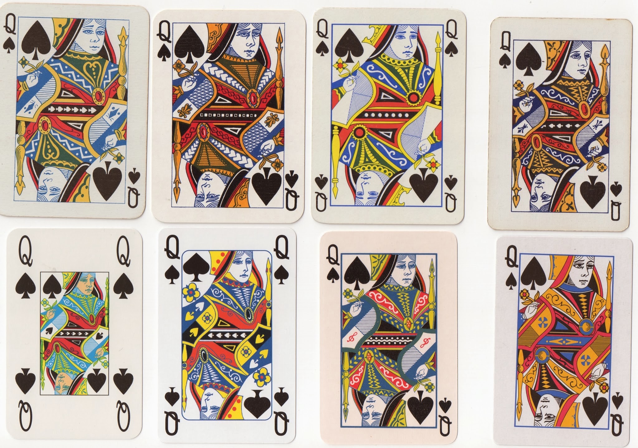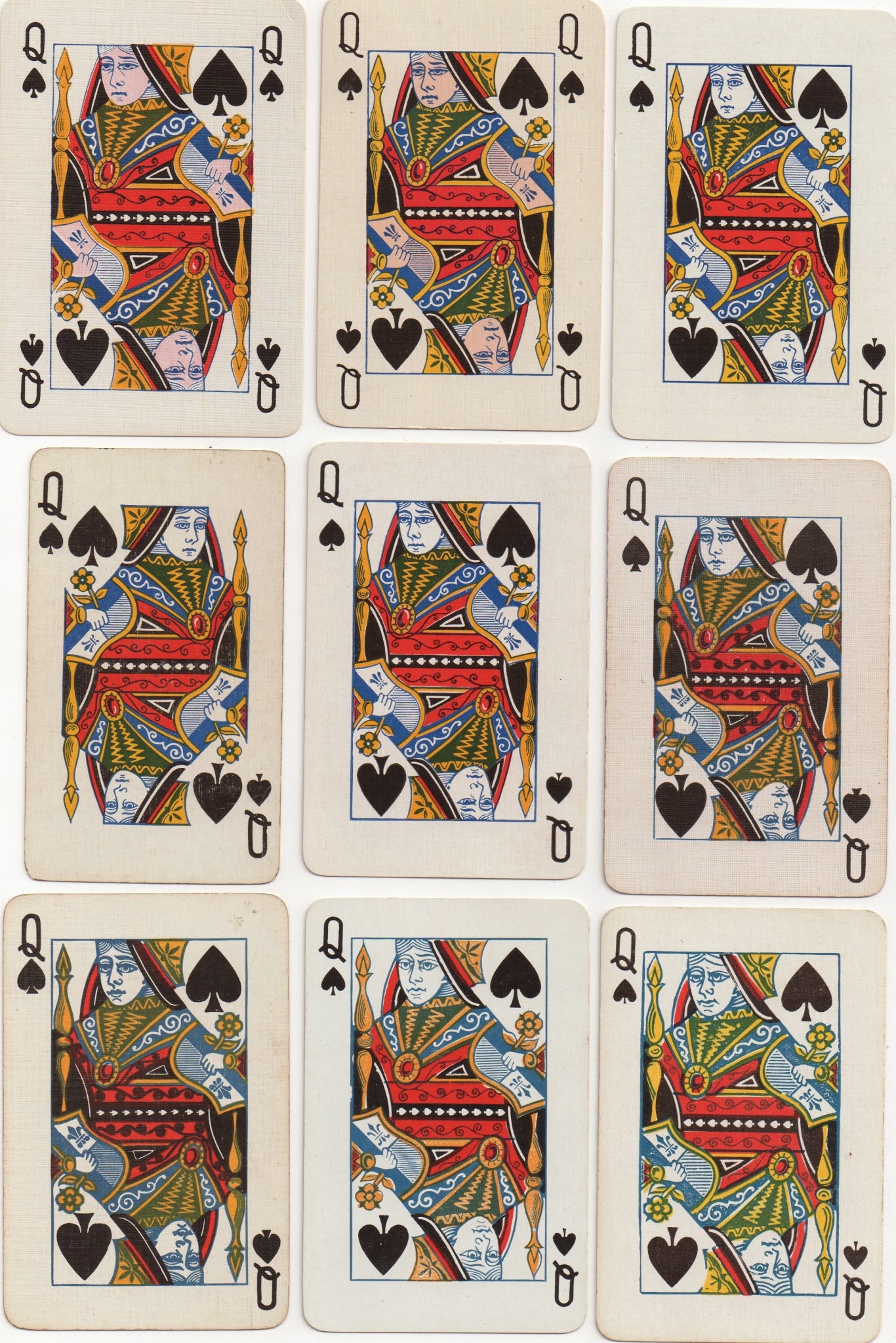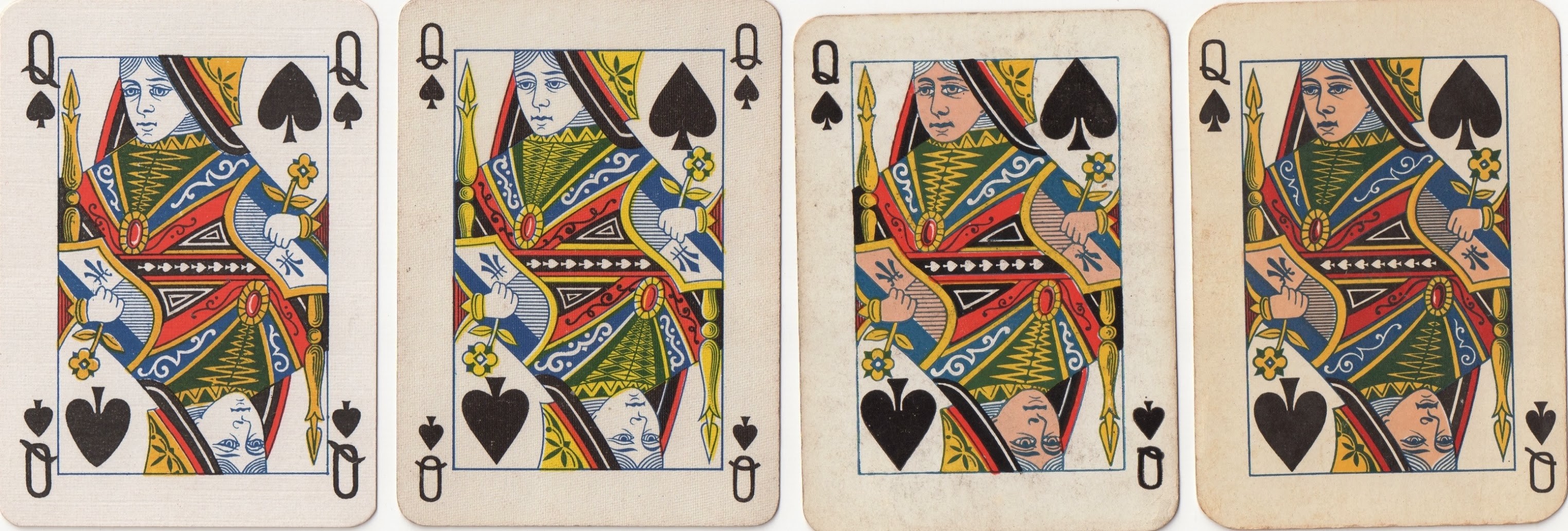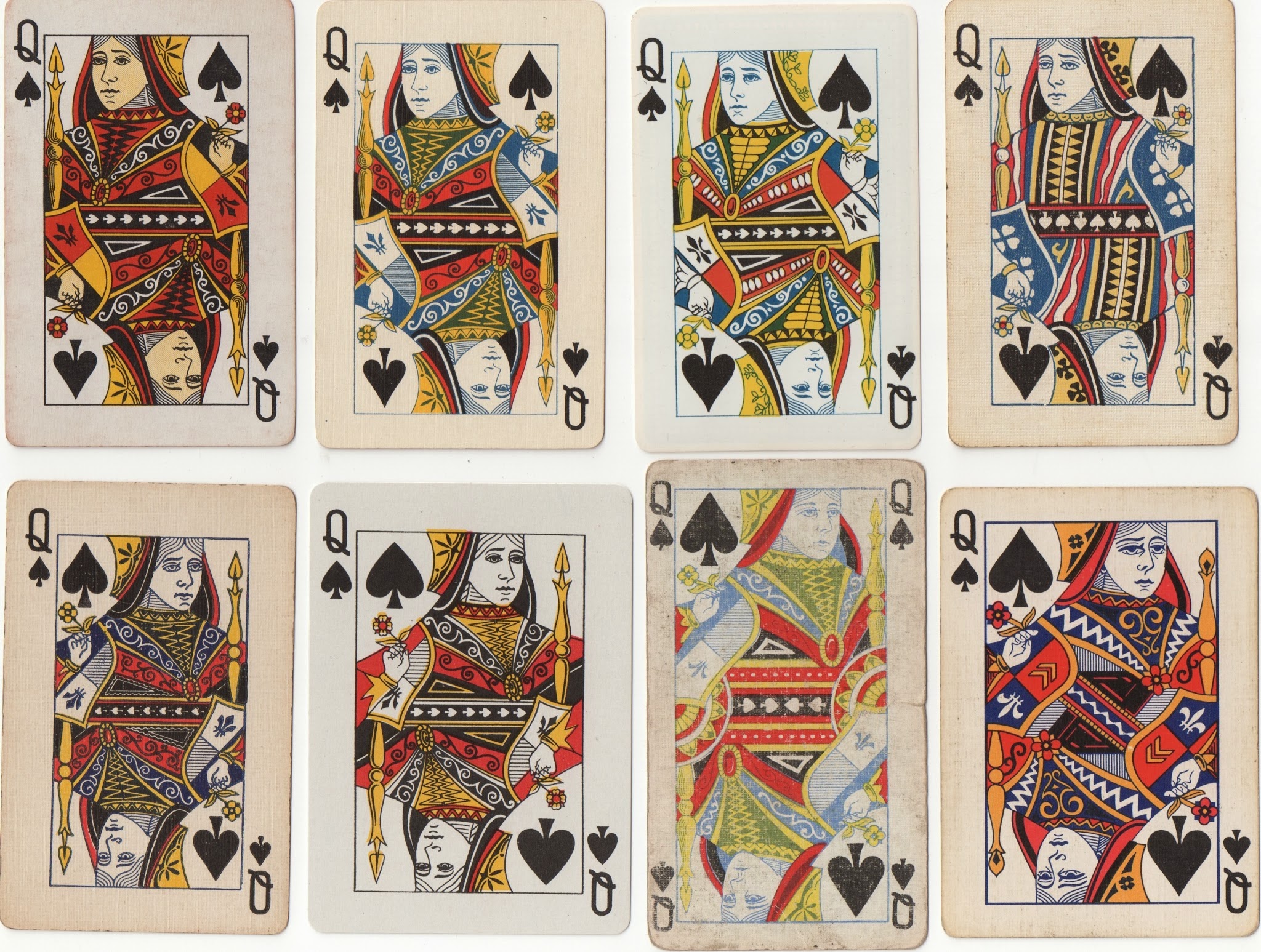 Note that in the two previous designs the QS has her hand sloping upwards in parallel to the edge of her sleeve: this is a particular defiining characteristic of these designs and their copies. These two designs were copied widely within the United States and a turned version of US3.1 was used in bridge cards. As far as I know, this turned version (US3.2) was not used by USPCC itself. Below are a selection of QSs by other American makers from the 1930s, unturned copies on the top row and turned ones, both US3.2 and US4, at the bottom. Notice how the clothing can be redrawn considerably in some cases.