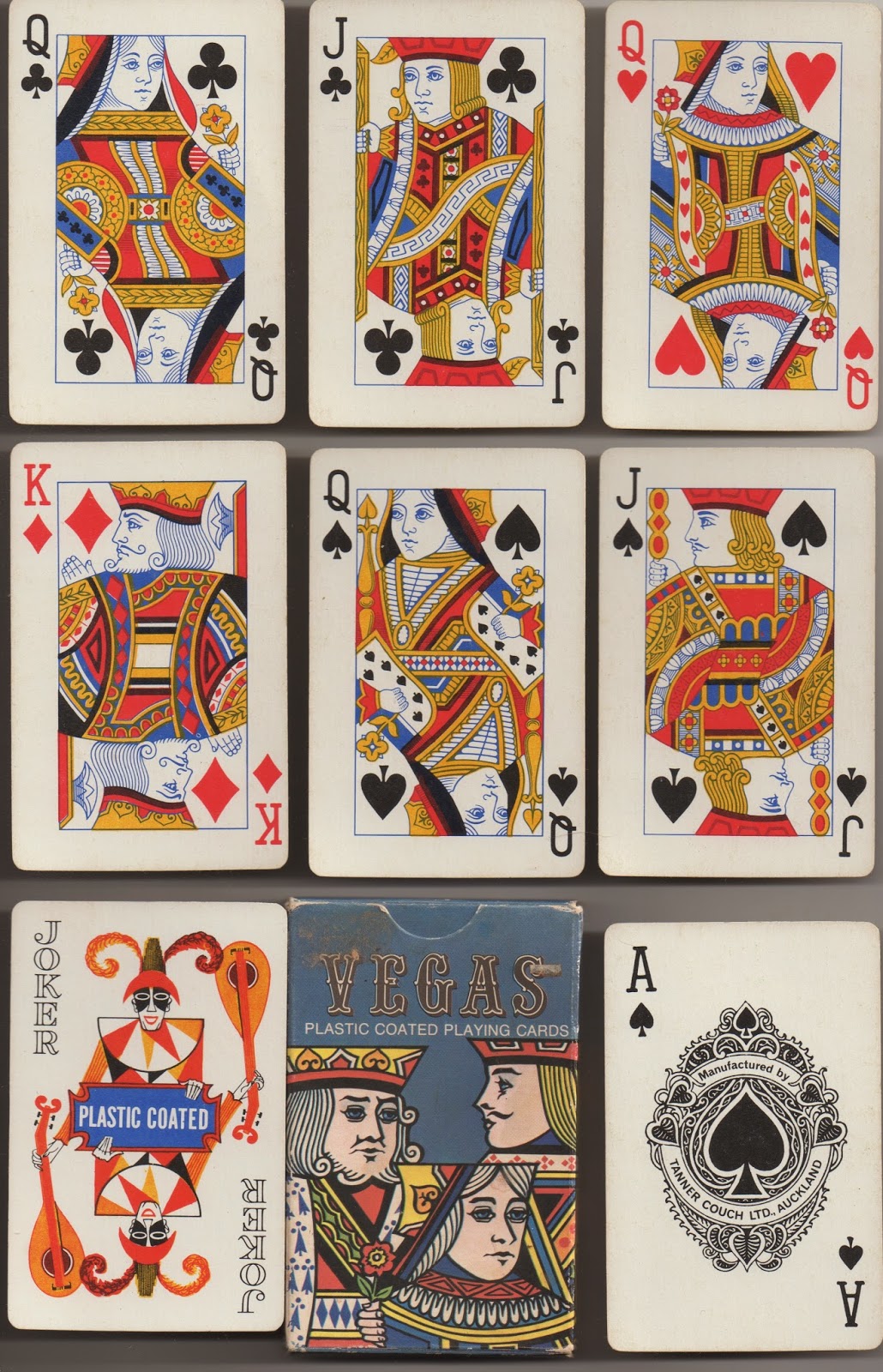 In 1972 the firm was taken over by Tanner Couch Ltd., a wholesale stationers that started in 1956. The AS remained the same with the new name but the courts were Waddington's version of Goodall's courts with a Waddington joker and were possibly printed by Waddington. Later, an unusual version of Waddington's Goodall courts was used with all the queens and jacks turned. The joker is an exact copy of Whitman's. They may have been printed in Singapore or Hong Kong, but that's just a guess. In 1989 the firm sold out to the Australian firm, John Sands Ltd.