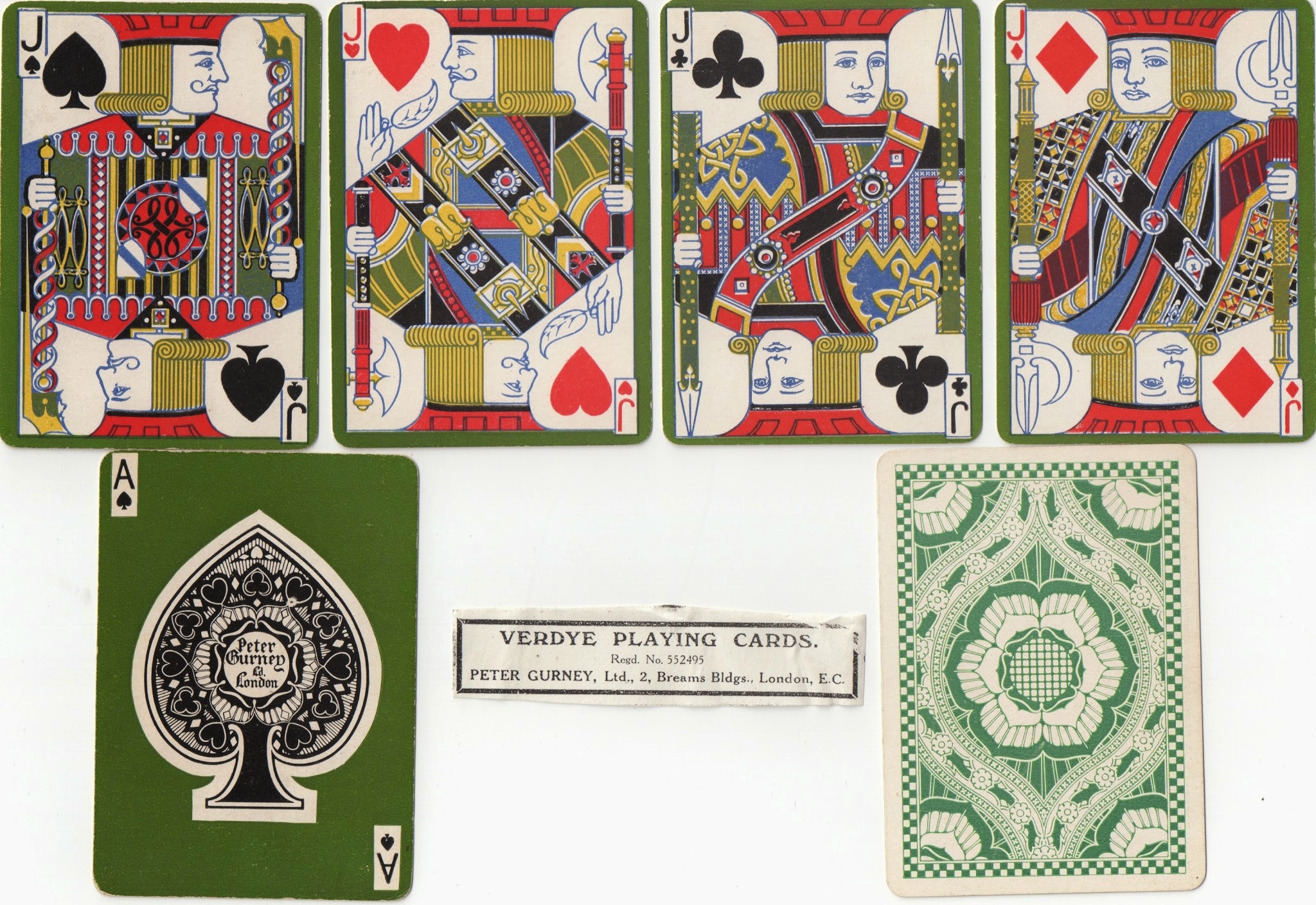 However, he also produced an elaborate version of the English pattern at about the same time. It's called Verdye and the background of all the cards is green. The style of the courts is probably best described as Arts & Crafts. For a modern reproduction of these unusual courts, see page 51.