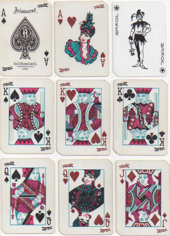 78 USPCC Aristocrat Club Special for Rio Casino, Las Vegas, strangely coloured US7 courts, Russell AS, cartoon head on QH and AH, 'Rio' on 10s to aces, 2000, box, VG+ £14