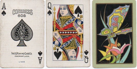 47 USPCC Congress imported to UK by Sloan, London, named Art Deco back Papillon (butterfly), no joker, side slide-in box with piece missing from outer case, 1929 (L), VG+ £6