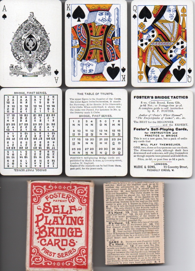 75 New York Consolidated Foster's Self-playing Bridge for Mudie, courts US6 with instruction leaflet and two extra advertising cards. A/QS missing. These appeared in 1903, replacing Dougherty's Self-playing Whist cards. There only seems to have been one series, but it was republished in c.1913 with Goodall cards (see item 76). Slightly worn box, VG+ £22