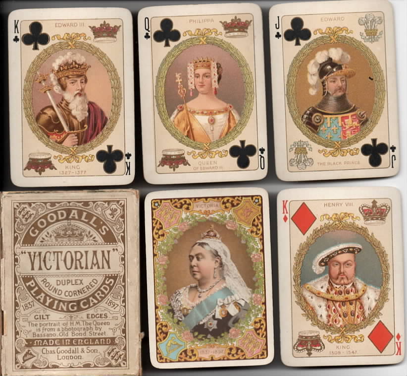 1 Goodall for Victoria's Golden Jubilee, 1897, royal dynasties on the courts, gold edges, damaged box, cards are unused £32