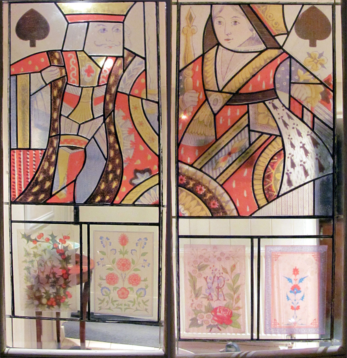 We have recently been lucky enough to get to know a glass artist, Neil Harvey, who also lives in Bungay and was really taken with the old playing cards I showed him. He could see lots of potential from his particular artistic perspective. In the end we agreed that it would be a great idea to put glass panels in two of the three openings with a playing card theme. We chose the king and queen of spades from De La Rue’s redrawn single-figure courts of the 1840s (D3) and, since there was plenty of room, some appropriate Owen Jones back designs as a lower panel on each. One of these is the design for Prince Albert of 1851 (under the king) and the other that for Queen Victoria. These are the windows as seen from the kitchen.