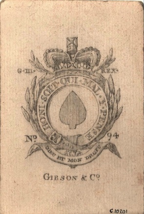 The above pack is a very early Gibson pack with characteristics that eventually disappeared from the design, e.g. the sleeve beyond the edge of the design on the JS and the jutting-out jaw of the KC. Gibson, however, was to become a major maker of the late 18th century. I start with an early example from the Cuming Museum collection.