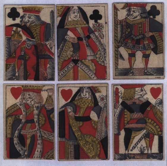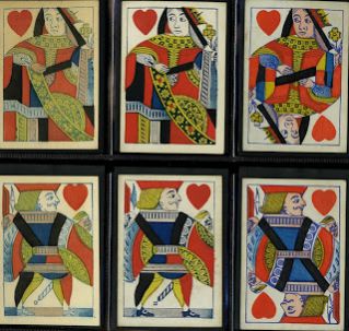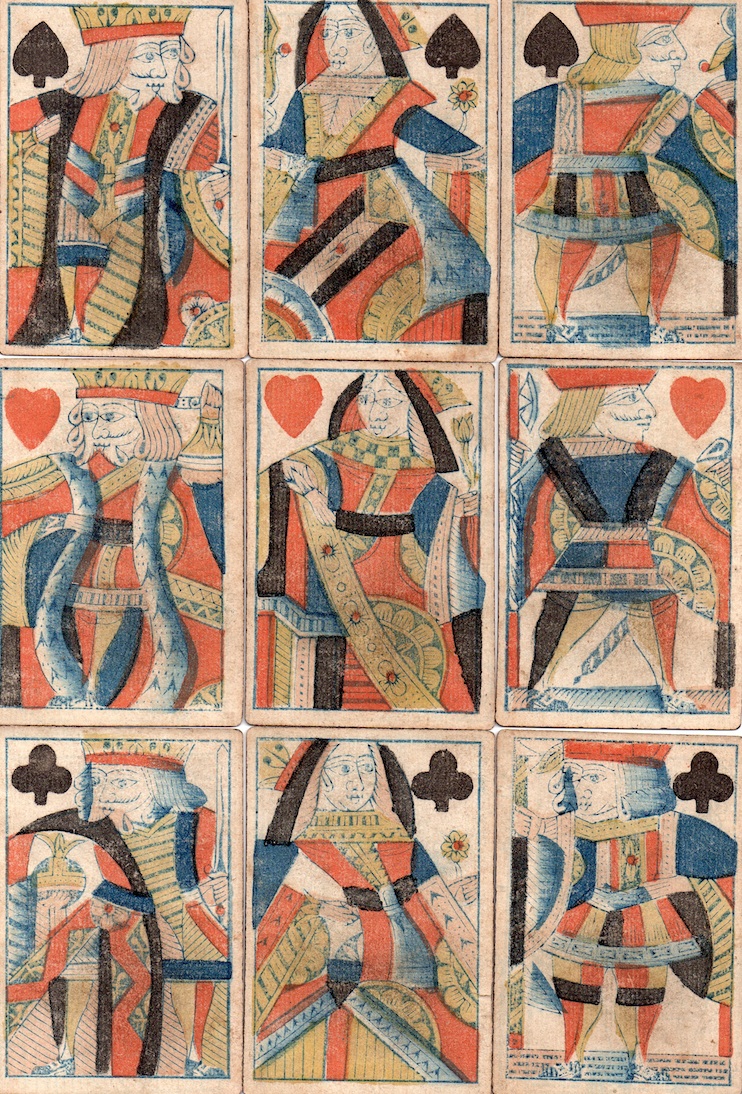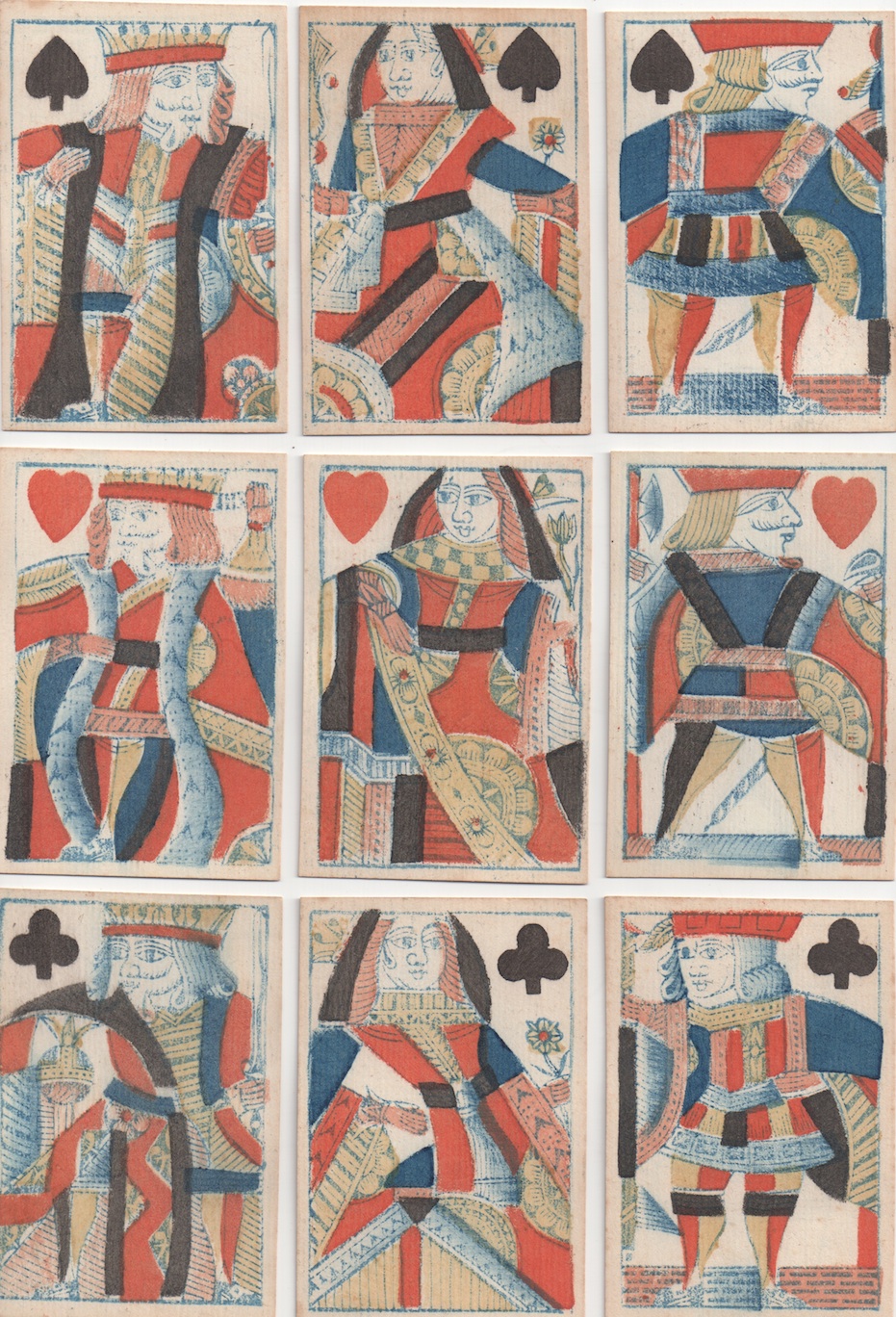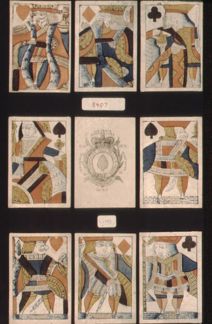 Another early pack, but with the more usual later courts by Hunt, c.1795, from Sylvia Mann's collection. Note that the KH is of the Hall type; as the outline is black rather than blue, it is probably not original.
