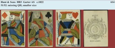 Hunt seems to have developed further the idea of smaller cards, as those above, which most other makers only produced in piquet cards. They also produced smaller cards with full-size courts of a traditional kind (HB3).