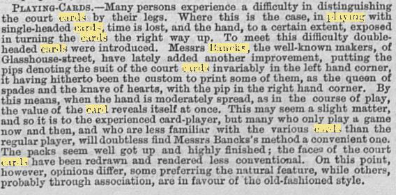 Although we have seen that Bancks Brothers dwindled fairly rapidly in the 1850s, they did try some updating of their cards. As far as I'm aware, they were the first to produce a pack with all the pips on the left, thereby turning six of the court figures. This was done in the Old Frizzle period with cards that were smaller than the norm at that time.