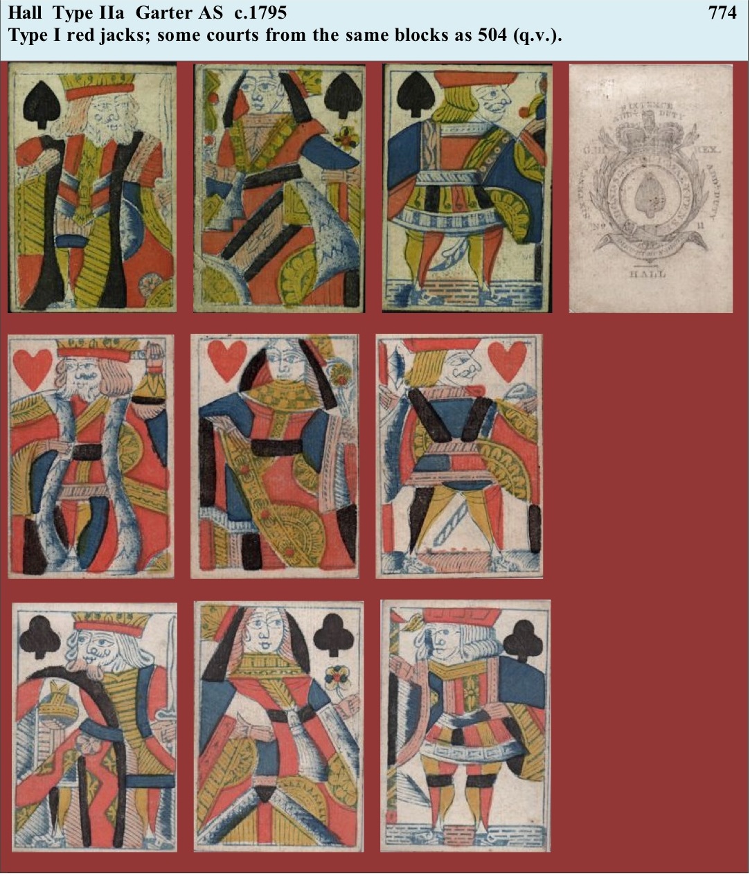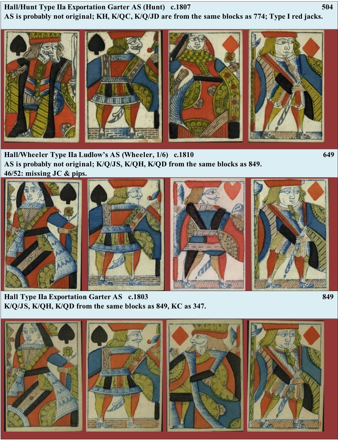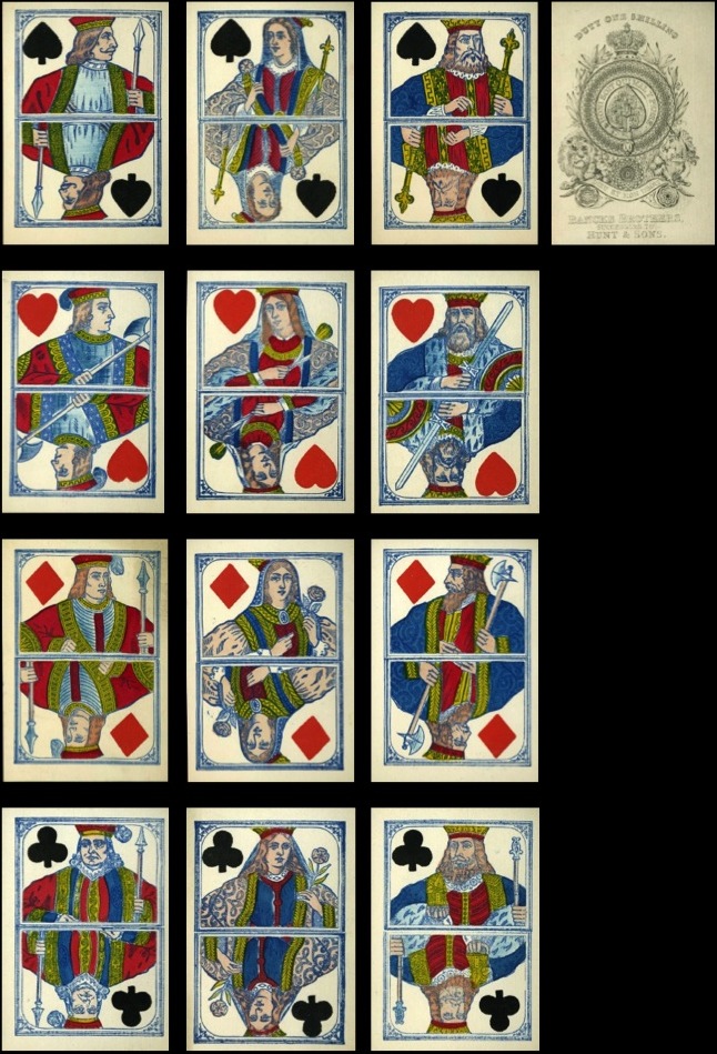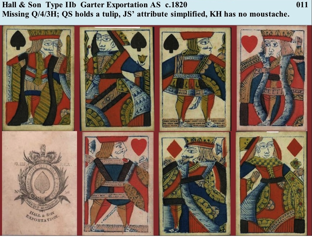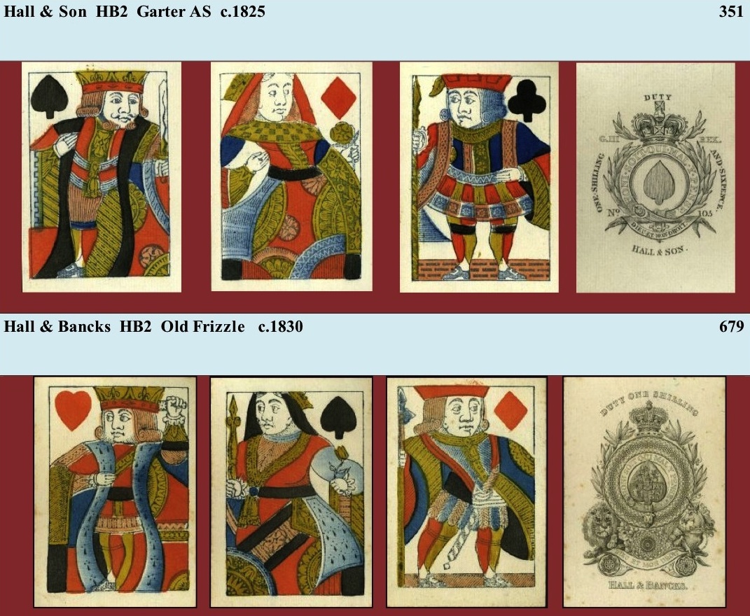 In around 1823 Hall was joined by Bancks and a new set of courts (HB2), which have some resemblance to the redrawn courts of Hunt (HB1; see previous page), were produced. For a while after the new firm was set up Hall & Son cards can be found in Hall & Bancks wrappers. HB2 continued into the Old Frizzle period.