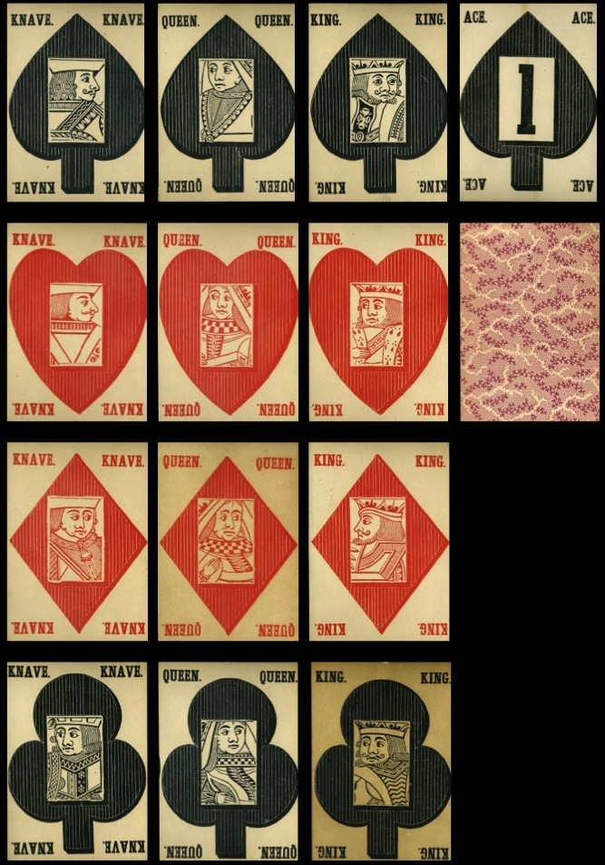 But for whatever reason they lost their share of the market and by 1880, when they introduced new printing methods, it was too late. The courts they produced (HB6) all had their pips on the left, but the queens all face in the same direction, so the design of the QS has had to be modified; the KH has lost a hand.