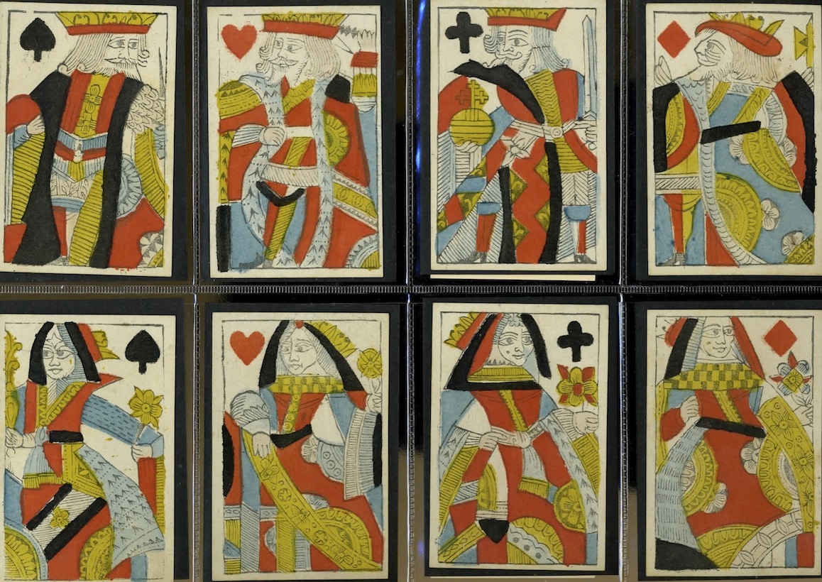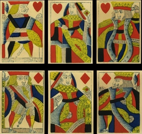 The cards were printed from copper plates, with the red suit symbols being applied later by stencil....
