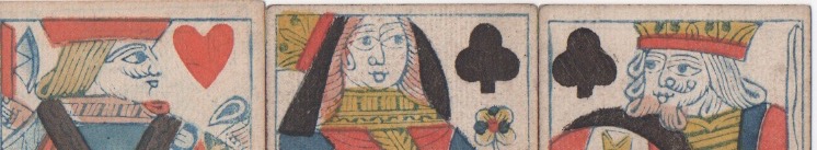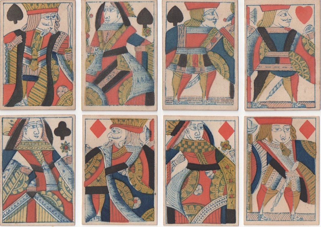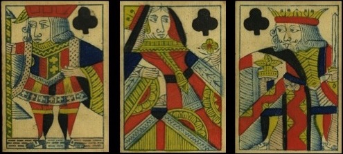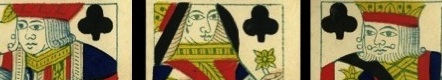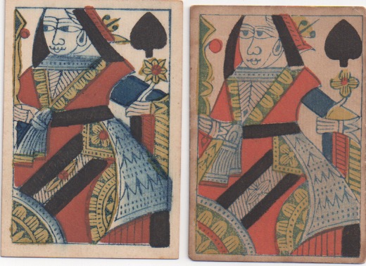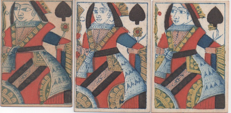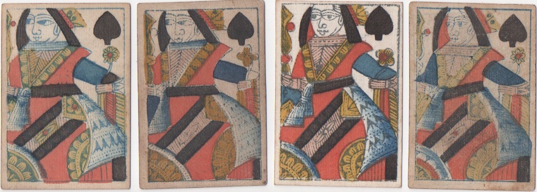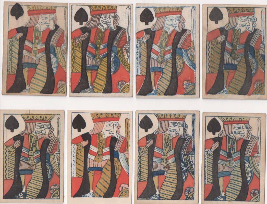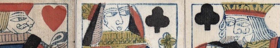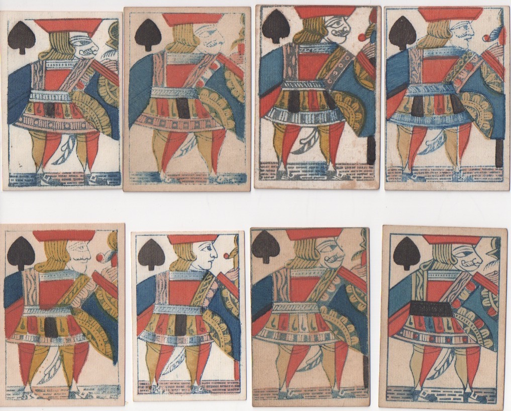 I want to present a simplified version of the classification system of woodblock cards that Paul Bostock and I worked out a few years ago. Although the minute details may be of relevance in some cases, I have tried to reduce the characteristics of both the blocks and the stencils to give a reliable way of attributing court cards to a particular maker. It has to be borne in mind that many actual examples of packs are mixed as part of the recycling of secondhand cards (legally or otherwise) and sorting them into the makers who made the constituent cards is something that this classification is an attempt to help with. There are even examples of 51 cards by one maker and the AS by another.