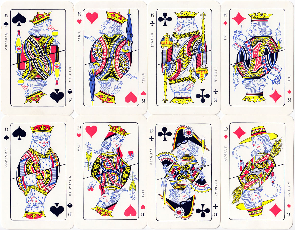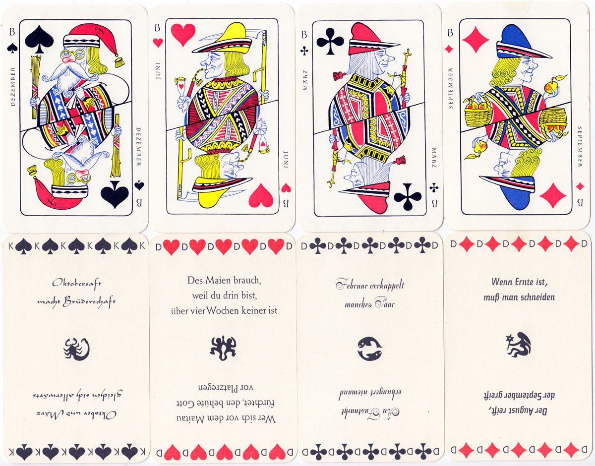 Not a pack of playing cards, but a New Years greeting in the form of 12 court cards, each one representing a month of the year. The comical looking courts are loosely based on those of the English pattern but have attributes and expressions representing the month in which they are shown. The reverse side of each card shows the appropriate sign of the zodiac and has a saying in German on each end of the card. The sayings are all representative of the month. You can have fun translating the four card backs shown below.