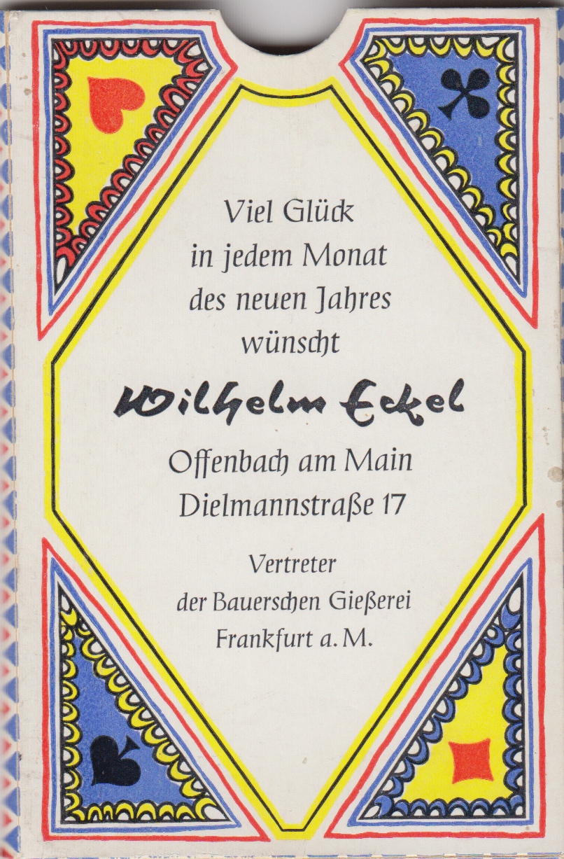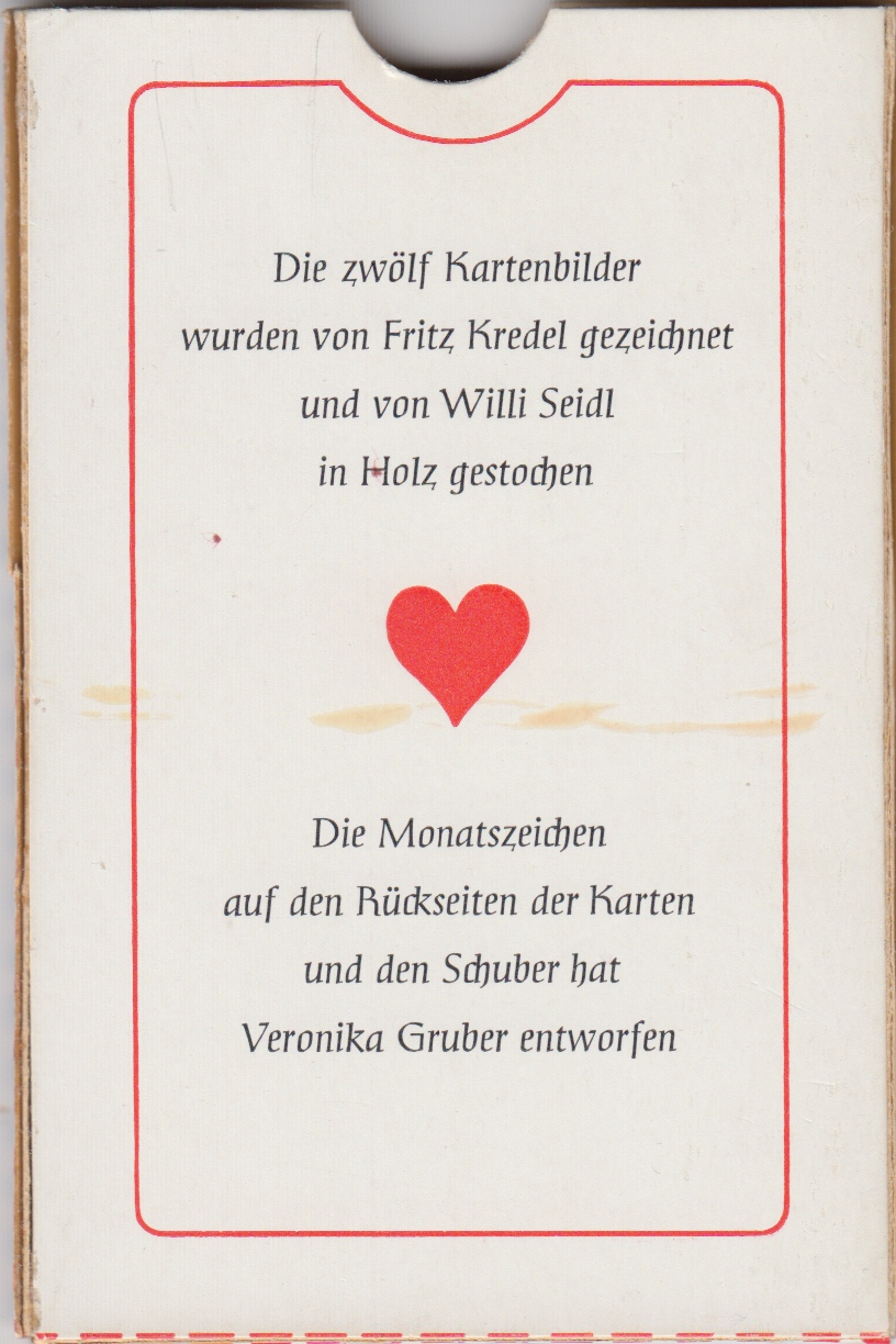 The cards, which are slightly larger than normal (102 x 65 mm), come in a slim decorated cardboard slipcase which tells us that the cards were presented by Wilhelm Eckel of Offenbach who was a representative of the Bauerschen Gießerei (German Type Foundry) which existed from 1887 until 1972. This set is probably from the 1960's. The card images were drawn by Fritz Kredel and wood engraved by Willi Seidl. The case and backs were designed by Veronica Gruber. An interesting curiosity !