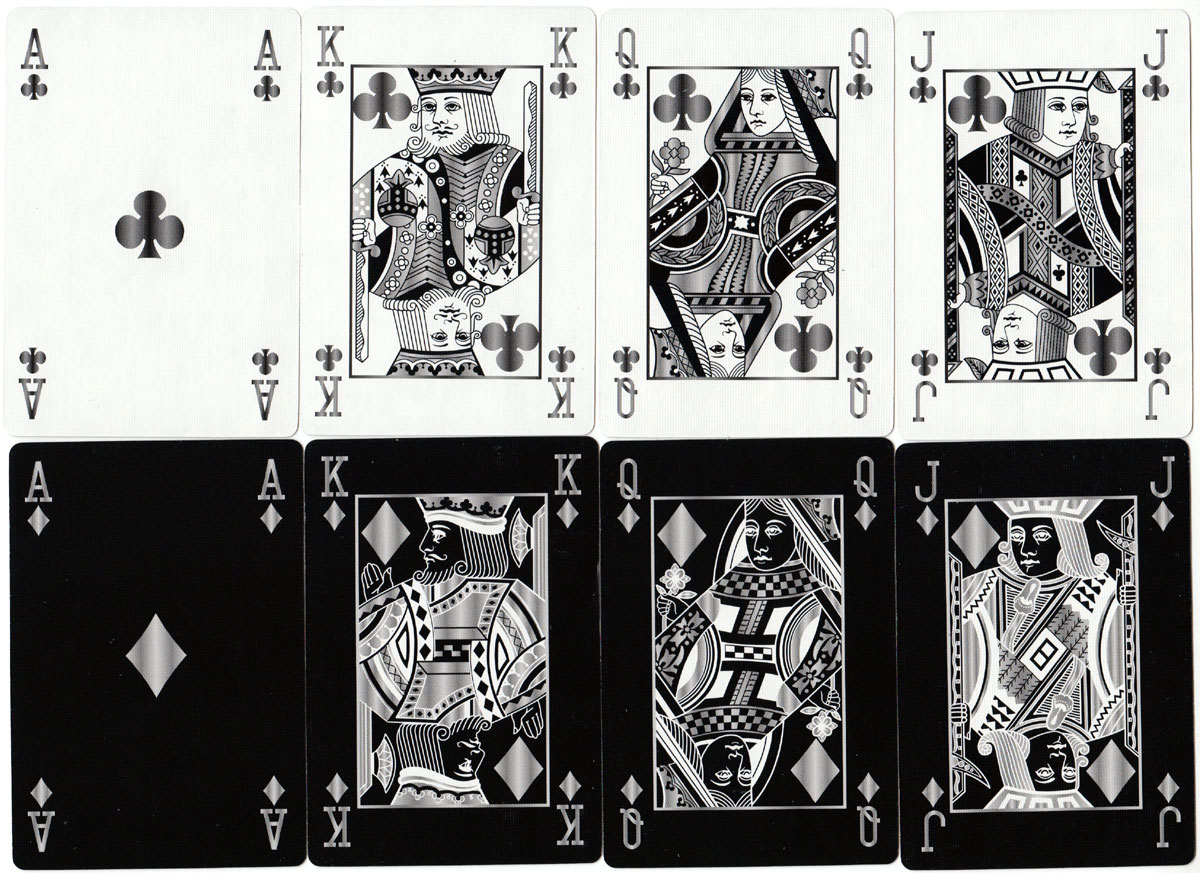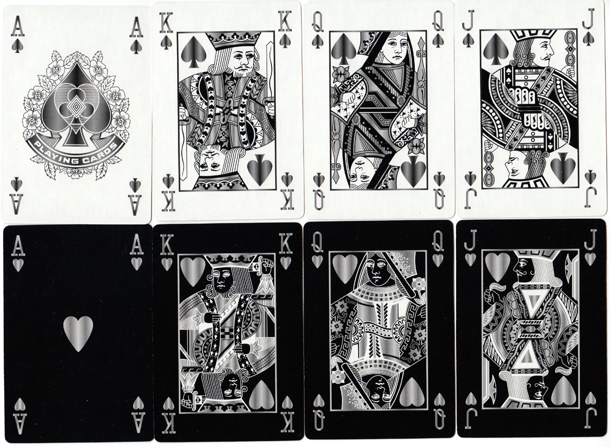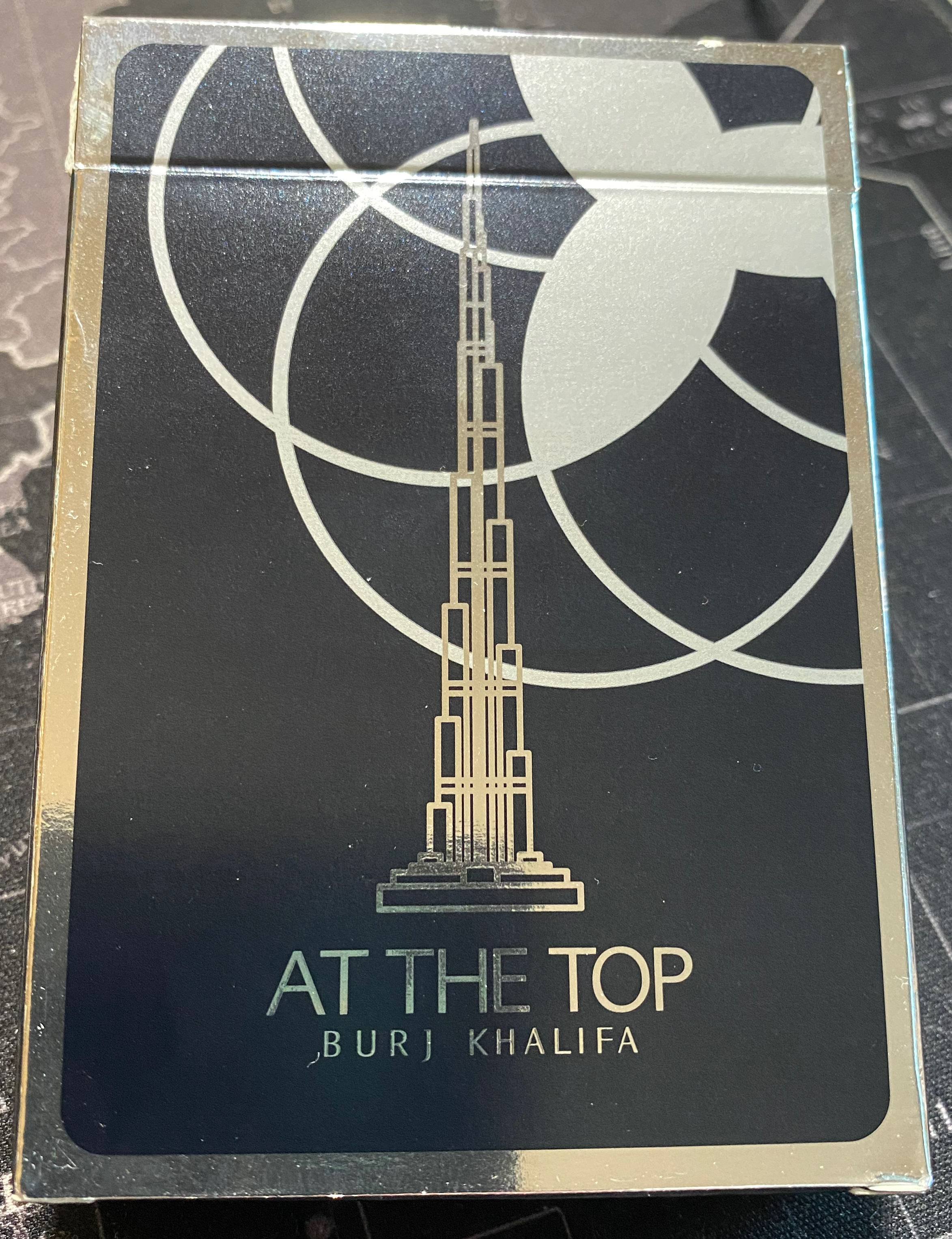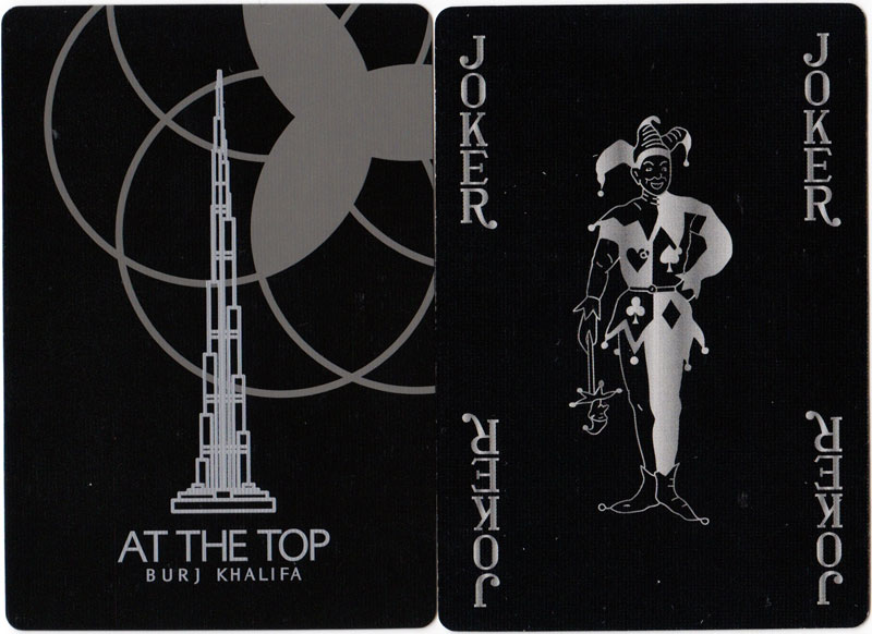 I was in Dubai for a few days in 2016 and wanted to visit the tallest building in the world, the Burj Khalifa. The tower, which was opened in 2010, is 829 meters high and has 163 floors. The Top is on the 124th floor and has an observation gallery and a souvenir shop where I purchased these playing cards. I was quite surprised to find that they were not just average English pattern souvenir cards but a nice variation in black and silver-grey. According to the box they were "exclusively designed for At The Top" so I presume that they are only available at the Burj Khalifa. They have a striking back design showing the Burj Khalifa in silver on a black background. The cards are made in China and the pack has 52 cards and 2 jokers.