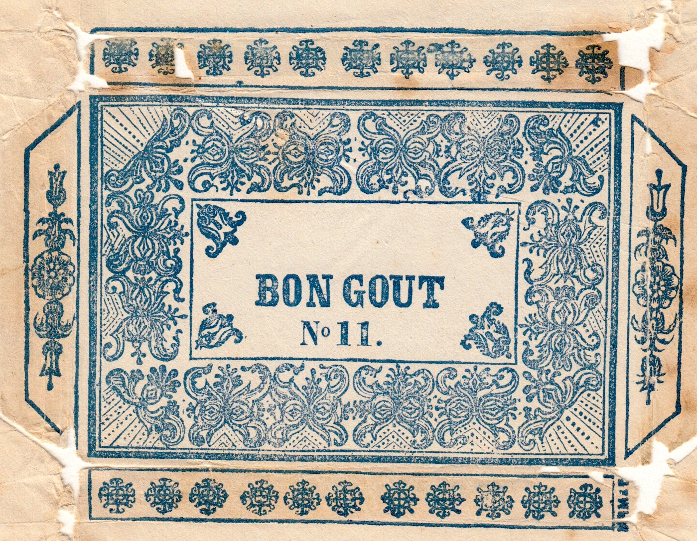The pack has its original wrapper which is named Bon Gout No.11, a luxury pattern printed by Mesmaekers & Moentack of Turnhout Belgium. This factory only existed between 1859 and 1862 after which is became Mesmaekers Frères. The initials of the factory (M&MàT) are just visible on the bottom right hand corner of the wrapper shown below.