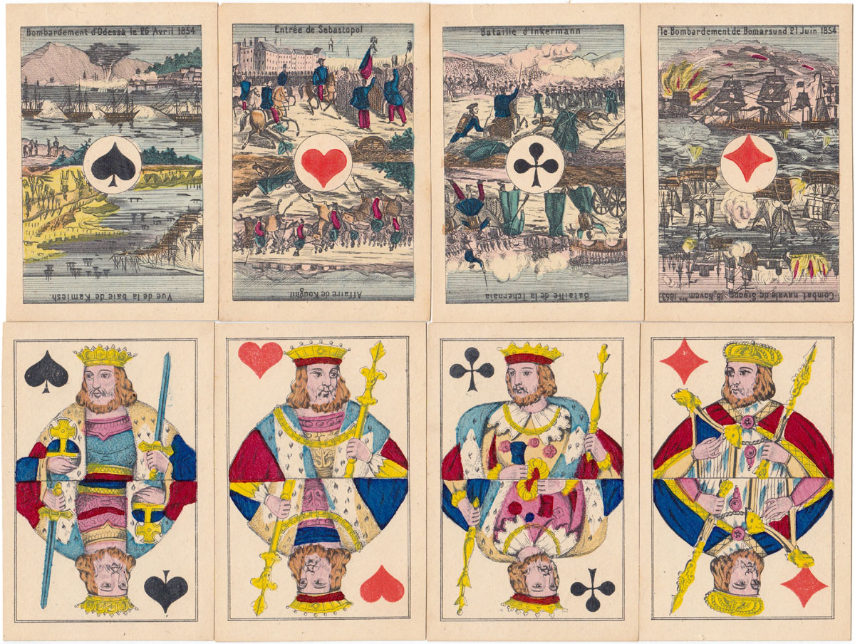 A pack of playing cards with scenic aces depicting some of the major battles from the Crimean war (1852 - 1856) in which Russia was defeated by an alliance of the Ottoman Empire, France, United Kingdom and Piedmont-Sardinia.