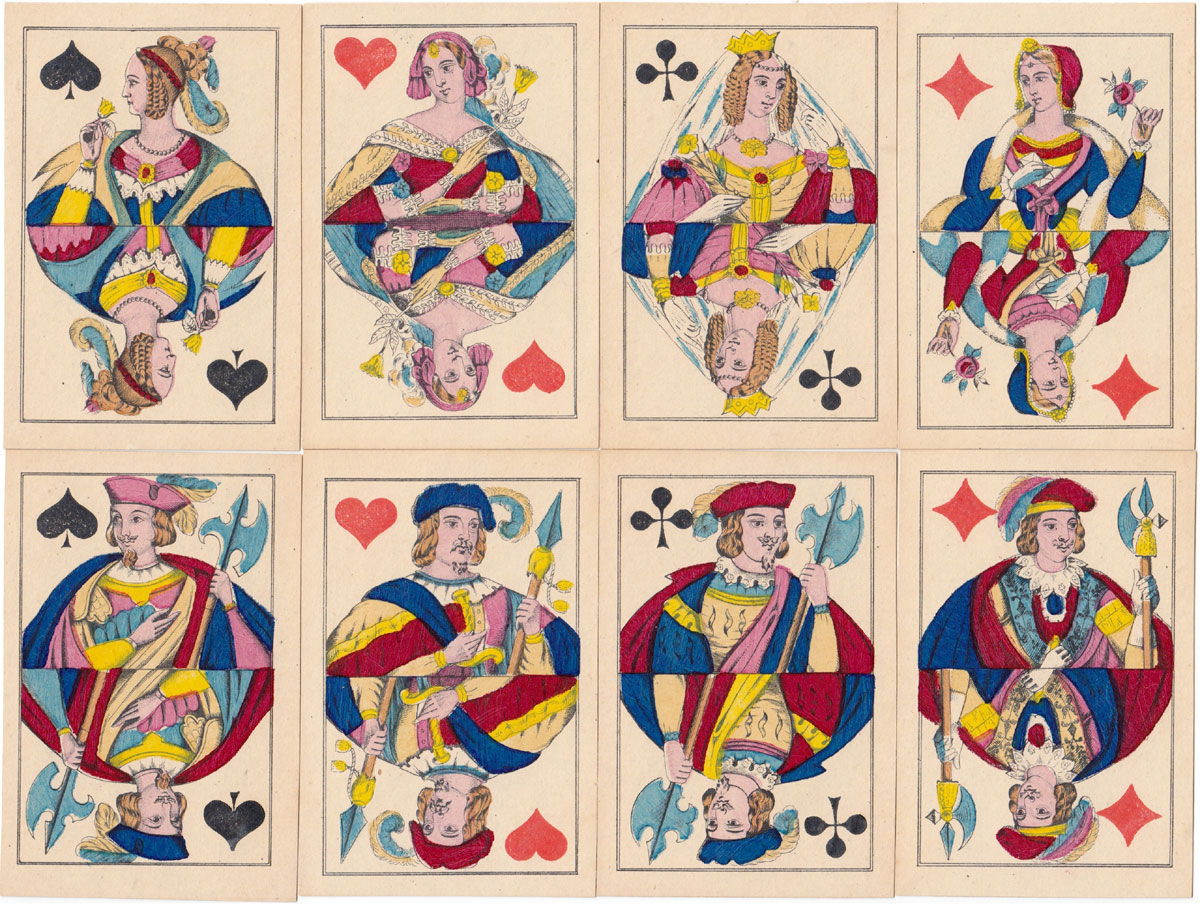 Printed in about 1860, this pack consists of 32 cards which are stencil coloured lithography with a different colour scheme at each end of the court cards, an indication of quality.