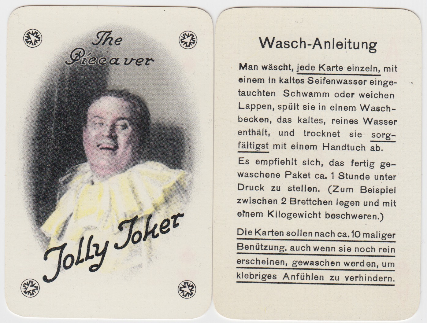 The English pattern court cards have a unique design and the large crowns on the kings and jacks are reminders of the Large Crown pattern often used on Austrian playing cards. The joker is quite special and shows a coloured portrait of Alfred Piccaver who was a renowned operatic tenor singer (1884-1958 Vienna). An extra card was included with the pack giving instructions on how to wash them. The pack has 52 cards, one joker and an extra card in a cardboard box.