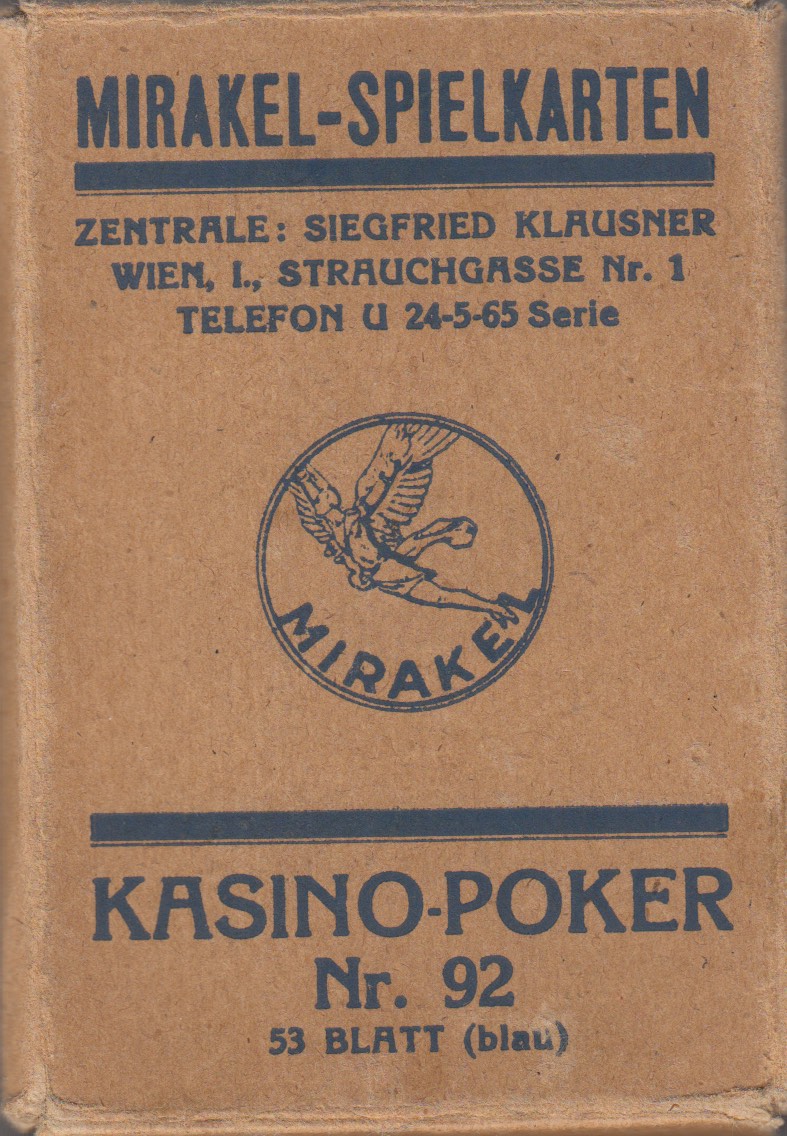 In a previous post I have shown celluloid playing cards made by ReoRex of Vienna (https://www.wopc.co.uk/members/paul-symons/reo-rex-luxus-bild). This pack is also made of celluloid but was published by Mirakel-Spielkarten of Vienna, Austria between 1930 and 1934. A patent for these celluloid cards was registered by Siegfried Klausner at the Austrian Patent Office in 1928. The cards were published under the name of Mirakel-Spielkarten but were actually printed by the Elbemühl Papierfabrieken und Graphische Industrie A.G. in Vienna, as shown on the king of hearts. The company moved to Leipzig in 1934 and changed its name to Mirakel GmbH.
