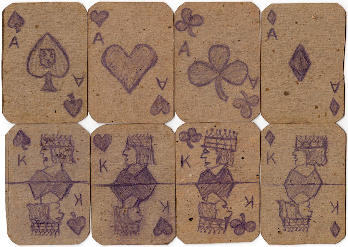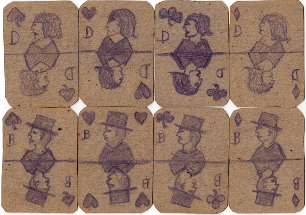 Hand-made playing cards by French prisoners of war in Porchester Castle, Hampshire, c.1796.