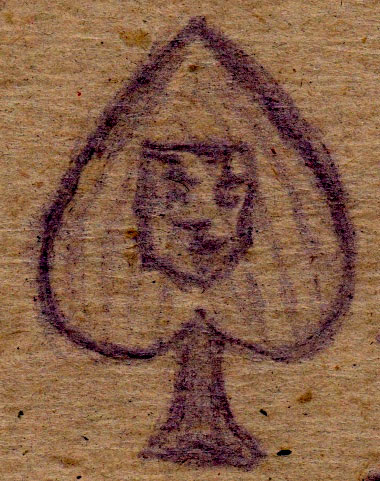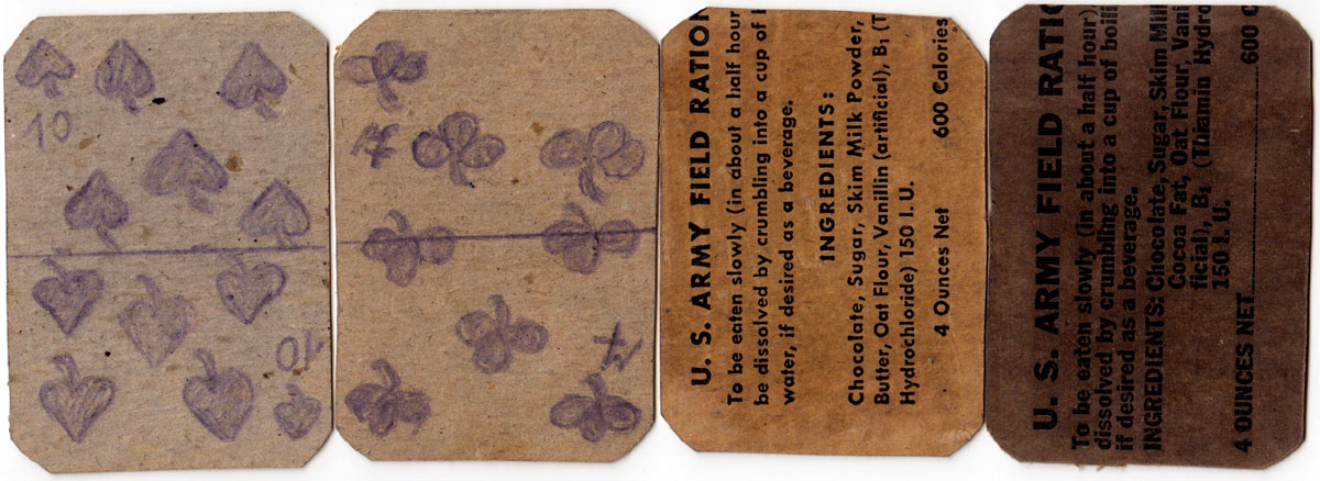The cards have been rather naively drawn, by a not very talented artist, using a purple crayon on the back of card cut from U.S. Army Field Ration packets. There are 32 cards with German indices which show that it was probably used for the game of Skat by the German prisoners. The cards are approximately 7.6 x 5.5 cm in size. The ace of spades shows a crest with a design which may indicate the German regiment or division in which the soldiers fought. However, I have not been able to interpret it myself. Maybe somebody who reads this has an idea. (Click image to zoom).