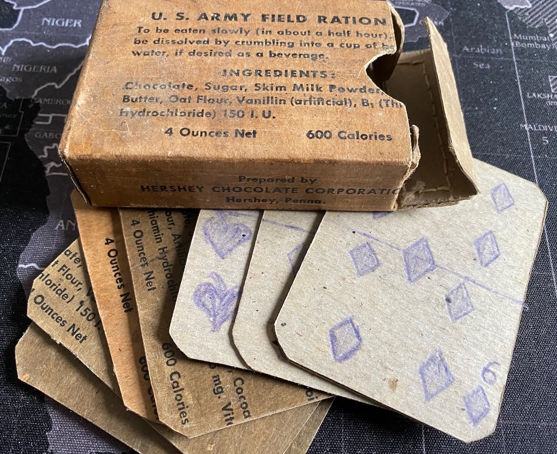 The ration boxes from which the cards are made held chocolate made by the Hershey Chocolate Corporation, but was apparently so hard as to be almost inedible. Maybe that is why it was given to the prisoners. The ration boxes are made from waxed card which is mostly thought to be to protect the contents against damp. However, after the attack on Pearl Harbour by the Japanese it was decided to wax proof the boxes against poisonous gas. This was done between about 1940 and 1948 (according to sources on internet).