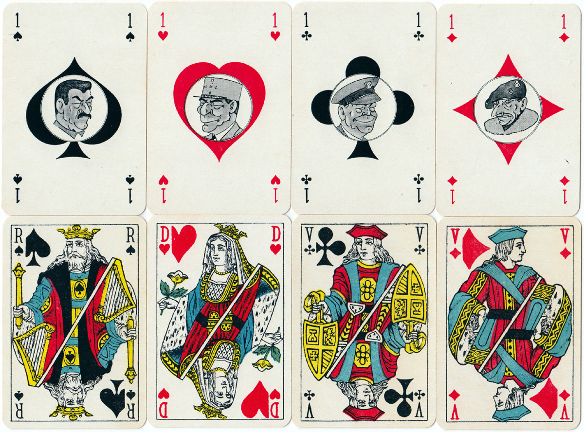 The aces all show caricatures of famous military commanders who were instrumental in the defeat of the Nazi's. They are: