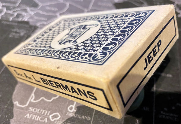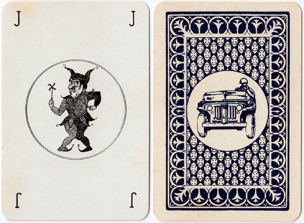 This pack of cards is one of several printed in Belgium at the end of Second World War to celebrate victory over the Nazis. It was printed by L. Biermans of Turnhout in 1945 and is specifically named 'Jeep', probably to honour the famous Willys jeep which was used extensively by the US army during the war. A picture of the jeep is also shown on the back of the cards.