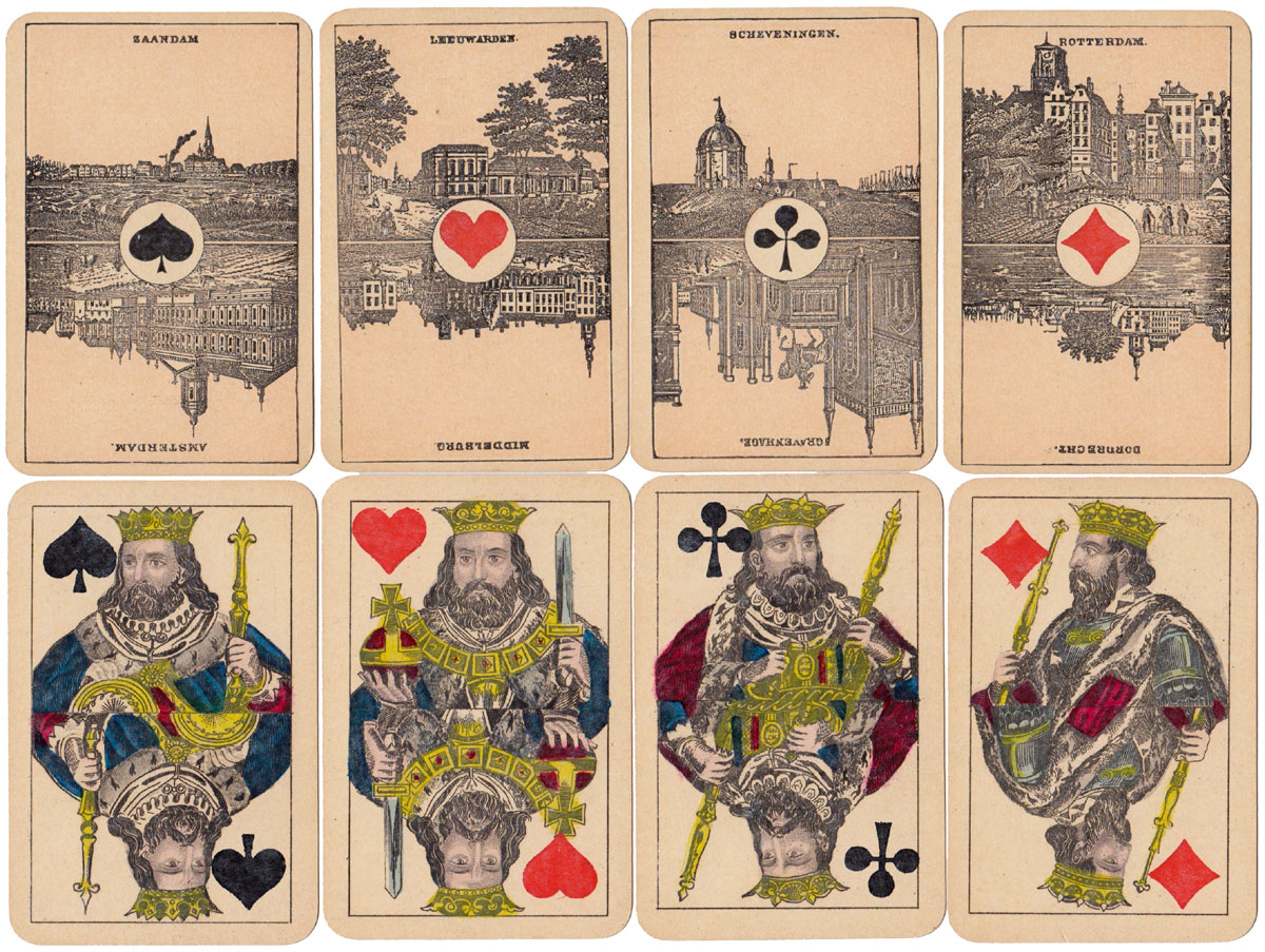 This is a later version of an engraved pack published by F.A.Lattmann of Goslar, Germany in 1870 under the name 'Holländische Whist No.9'. This version is lithographically printed and stencil coloured and dates from about 1880. The company logo is found on the jack of hearts and the indication No.9 on the jack of clubs. The monochrome double ended aces depict views of Dutch cities originating from about 1860. These aces have been used on other packs by Lattmann for export to The Netherlands, and are also similar to those used by several Turnhout factories on their costume playing cards.