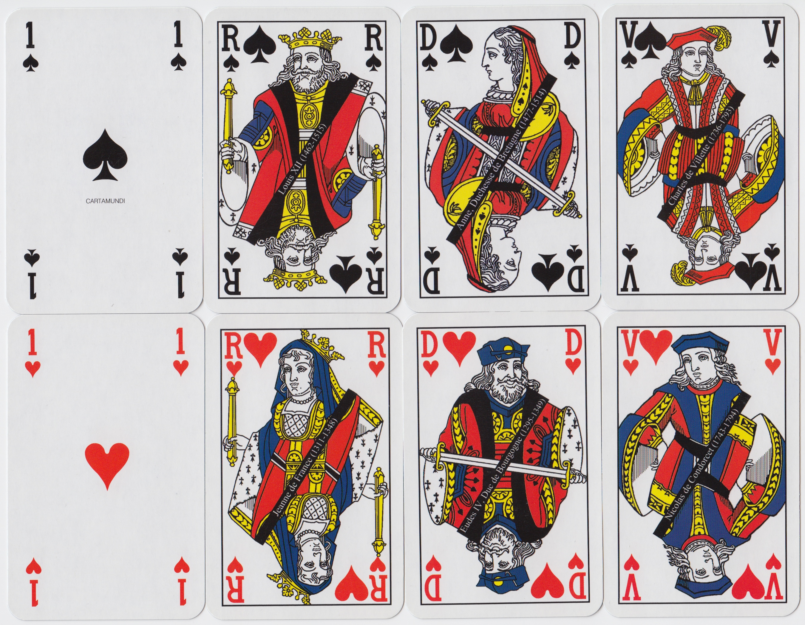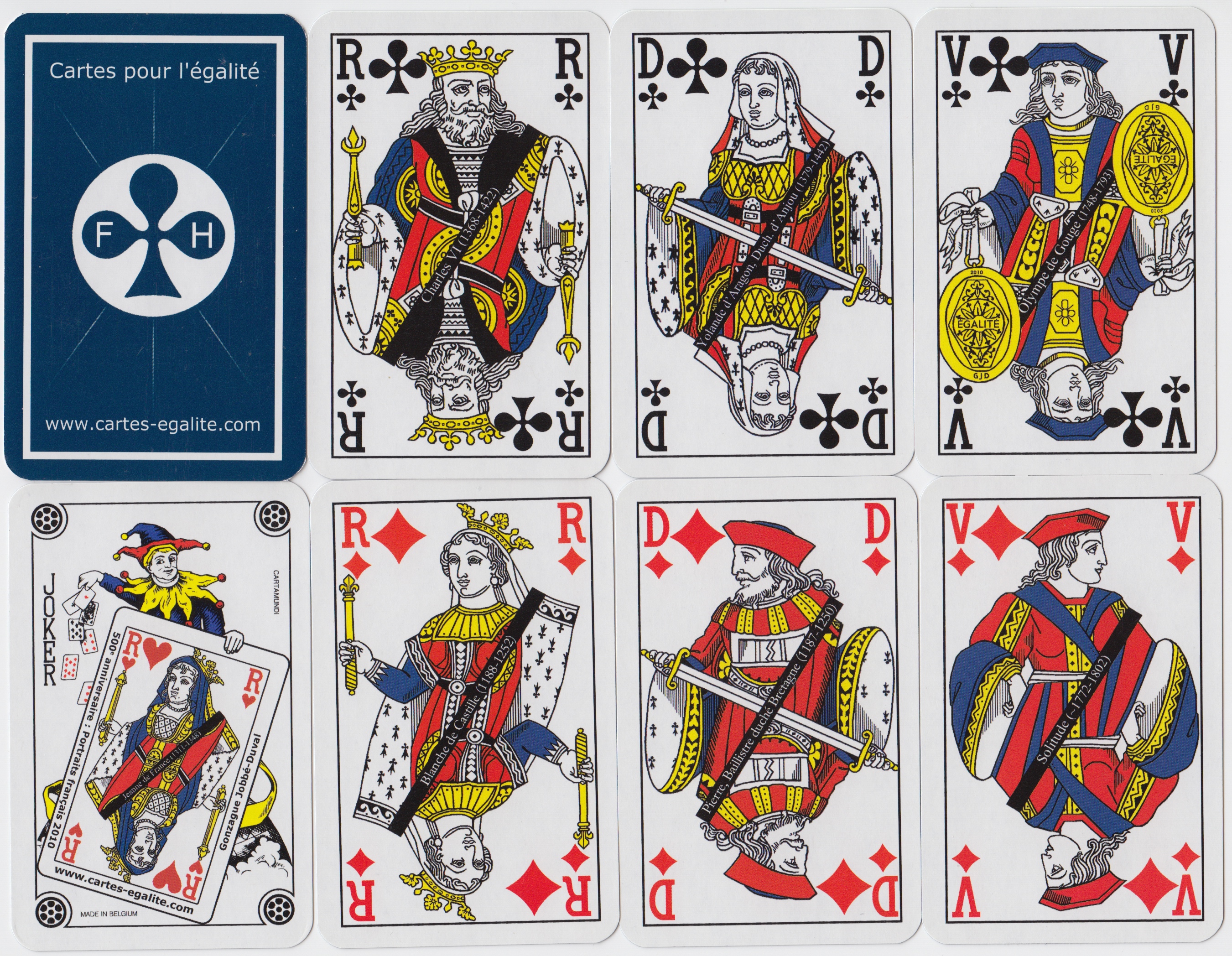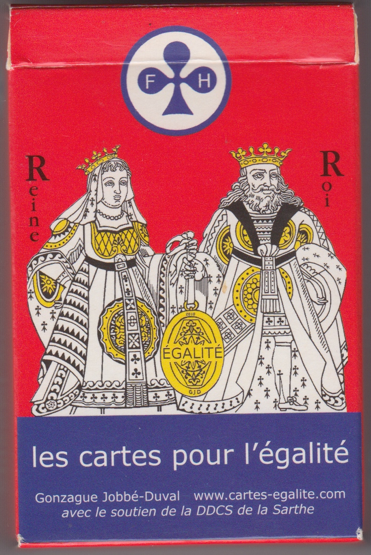 This pack of French standard pattern playing cards was made to create gender equality in the male dominated hierarchy of French suited playing cards. The Kings are no longer dominant and the kings (Roi) now consist of two kings and two queens. The queens (Dame) have been replaced with two dukes and two duchesses while the jacks (Valet) bear the names of revolutionary men & women who fought for the republic and gender equality. The pack was published in 2010 on the 500th anniversary of classic French cards according to the designer. The cards are the brainchild of Gonzaque Jobbé-Duval who decided to retain the traditional style of the court cards so that players can still easily use them. The pack has 52 cards and 2 jokers and was printed by Carta Mundi. Incuded is a explanatory leaflet in French.