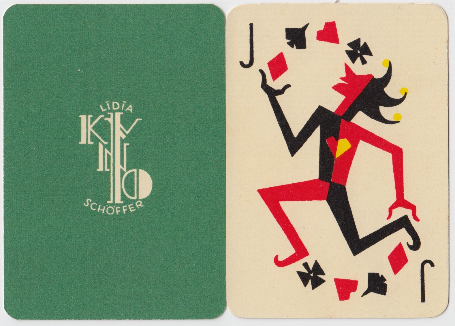 This pack of playing cards was the winning design of a competition organised for the pupils of Association of Arts and Crafts Education (Vereniging voor Kunstnijverheidsonderwijs) in Amsterdam. It is now known as the Rietveld Academy. The winner was Lidia Schöffer who designed these cards in a striking art-deco style using only three colours. They were printed lithographically by NV Drukkerij v.h. Dieperink & Co., Spuistraat 84, Amsterdam in 1942 in a limited number of 50 packs. There are rumours that a second edition was printed by the Speelkaartenfabriek Nederland but none have been found, and I have only ever seen a very few packs from the original edition. Whatever the case, it is an extremely rare pack to find. The pack consists of 52 cards plus one joker in a cardboard case, with either a blue or green reverse.