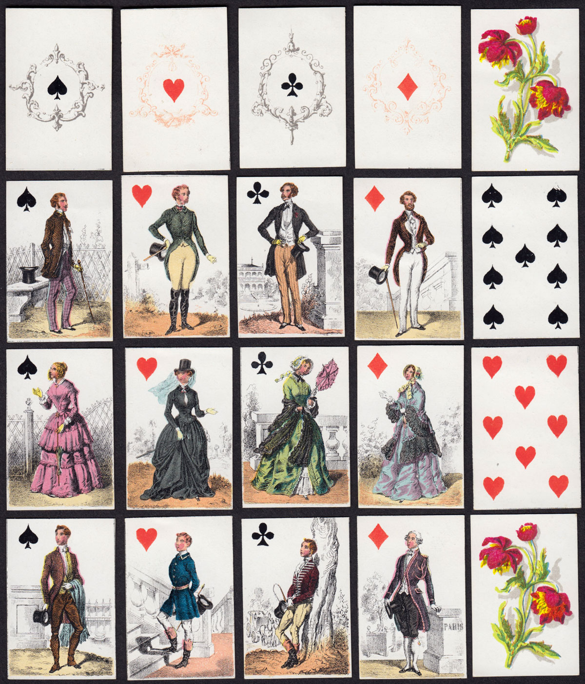 There have been several packs of cards produced in France in the mid 1800's depicting people in costumes and fashionable clothing of the period. However, this pack is an exquisite miniature version printed in chromolithography probably by Pierrat Imp. of Paris and designed by Ange Louis Janet Lange. There are copies of a standard size version of this pack in the Cary collection (France 388) and Fournier collection (France 216).