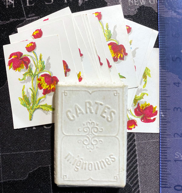 The kings are all elegant gentlemen while the jacks are younger men in service, all holding top hats. Even one of the fashionable queens is wearing a top hat. The back is beautifully decorated with a large flower. The cards a very tiny and are just 34 x 22 mm. in size. The pack has 32 cards and comes in a small white cardboard holder with the text 'Cartes Mignonnes' embossed on the front and 'Cartes Jouet' on the reverse.