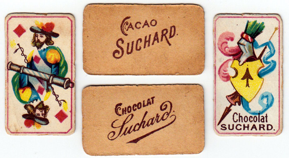 The Suchard chocolate factory is one of the oldest chocolate factories in Switzerland and was founded in 1826 by Phillipe Suchard in Serrières. After many takeovers, mergers and moves Suchard chocolate is now produced in a plant in Bludenz, Austria and Bern, Switzerland. This colourful and attractive miniature pack of 32 cards of only 33 x 19 millimetres in size was, judging by the style and printing, probably made in the early 20th. century in colour lithography. It has historical style courts and aces with a military theme and interestingly styled suit signs. The backs are plain brown with the name of the product. The aces and backs name two products, namely Cacao Suchard or Chocolat Suchard, which indicate that the cards may have been collected individually as inserts in packets of chocolate or cocoa. I have not been able to find any references or information about these cards, so if any readers can provide more information please contact me►