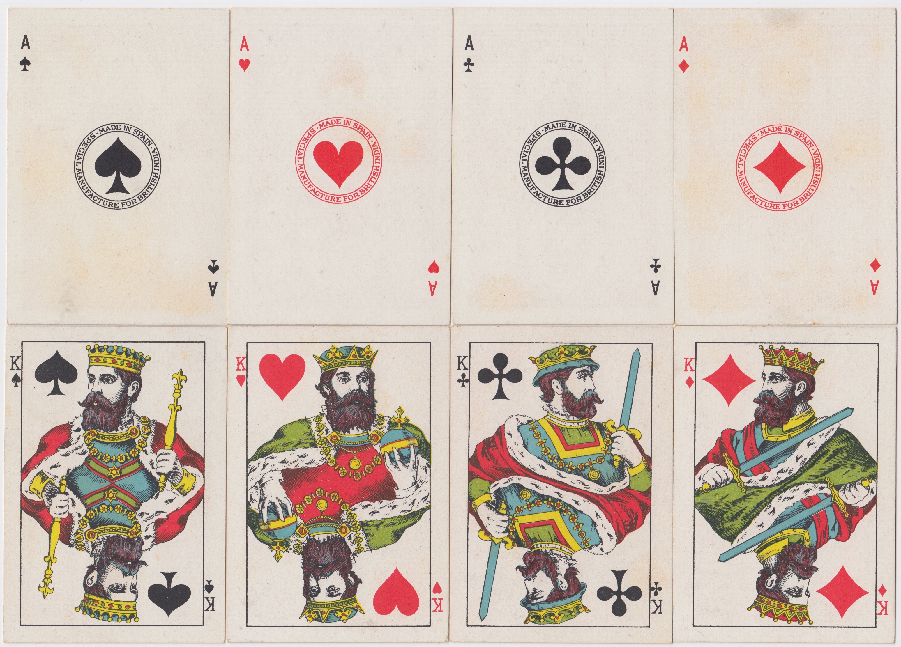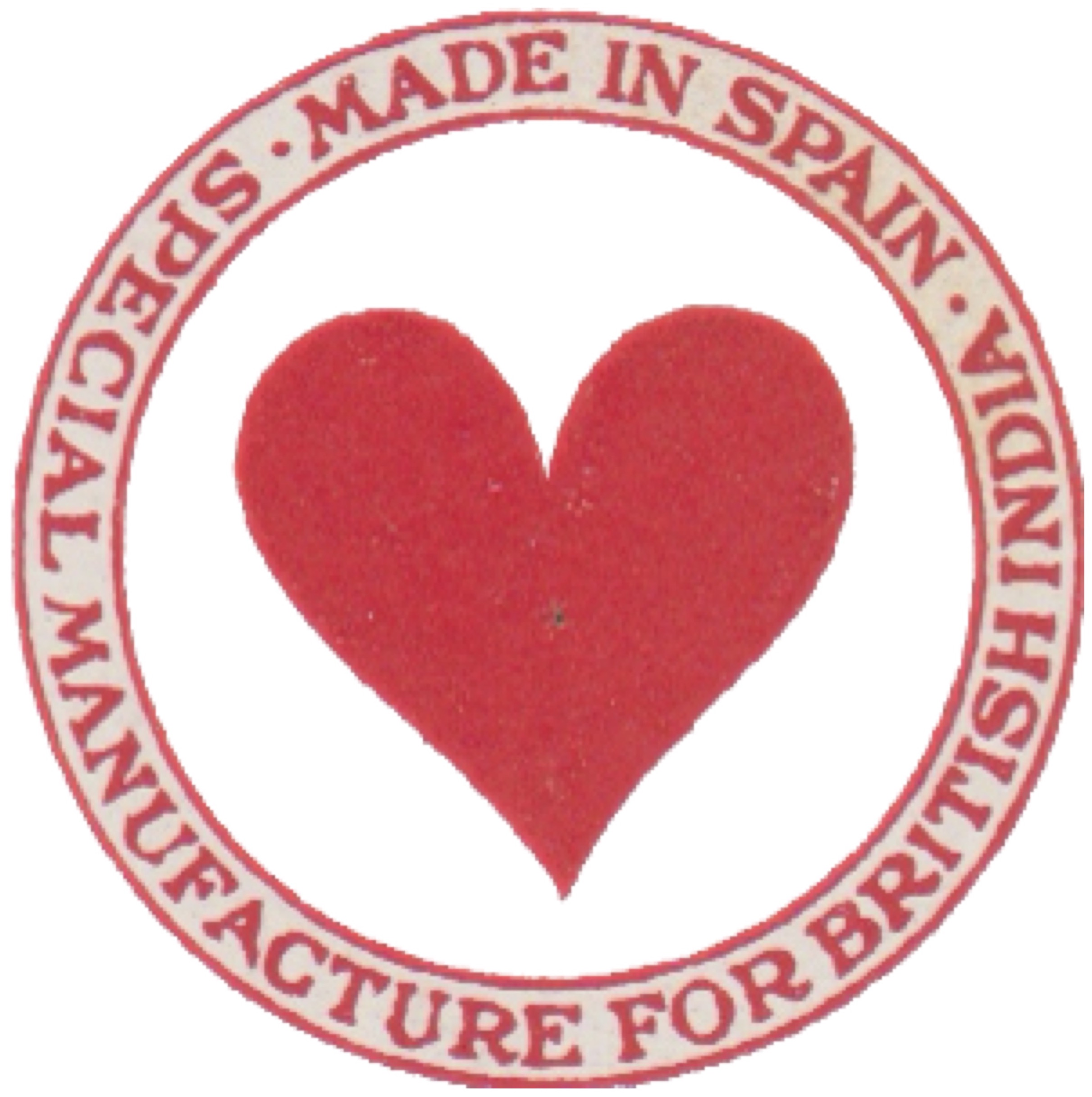 The aces all show the text 'Made in Spain. Special Manufacture for British India' indicating that the order came from India. The square corners and quality of the cards is quite similar to other packs ordered for India during the same period. The court cards are very similar, although not exactly the same, as those used by Emil Zippel of Hamburg (see here) for India, and those made by Ockelmann & Buss of Hamburg in 1920's. They are based on Rococo playing cards made by Dondorf.