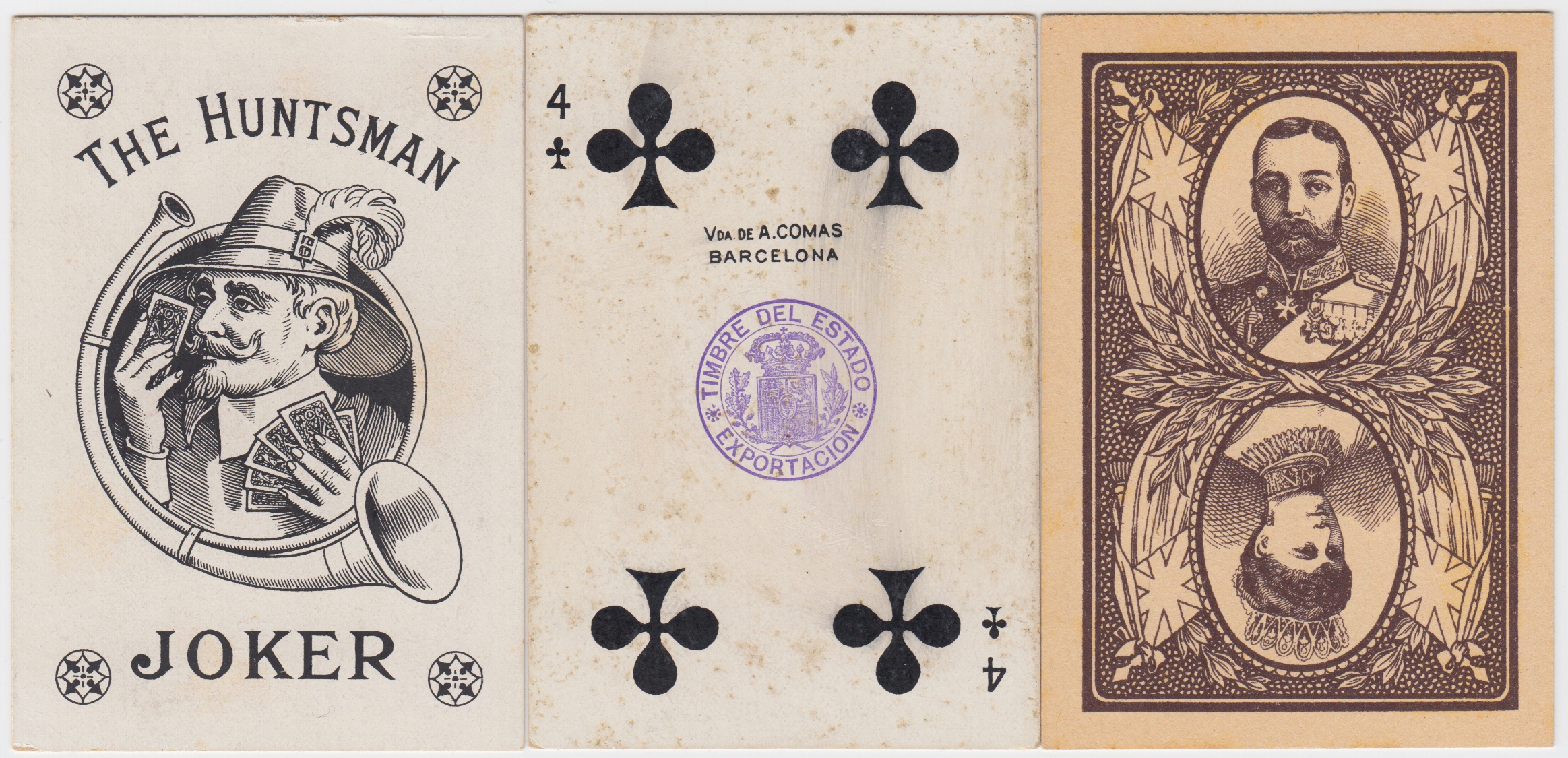 Unusually the cards celebrating the occasion were printed by a Spanish company Vda. de Antonio Comas, run by Josefa Ribo, who took over the company after the death of her husband Antonio in 1911. The cards were printed in 1911 or very soon after this date. The exportation tax stamp on the 4 of clubs was used from 1904 until 1931. The pack has 52 cards plus a standard COMAS 'huntsman' joker and came in a plain white box with one card stuck to the front. The reverse in two tone brown shows a portrait of King George V on one end and Queen Mary on the other.