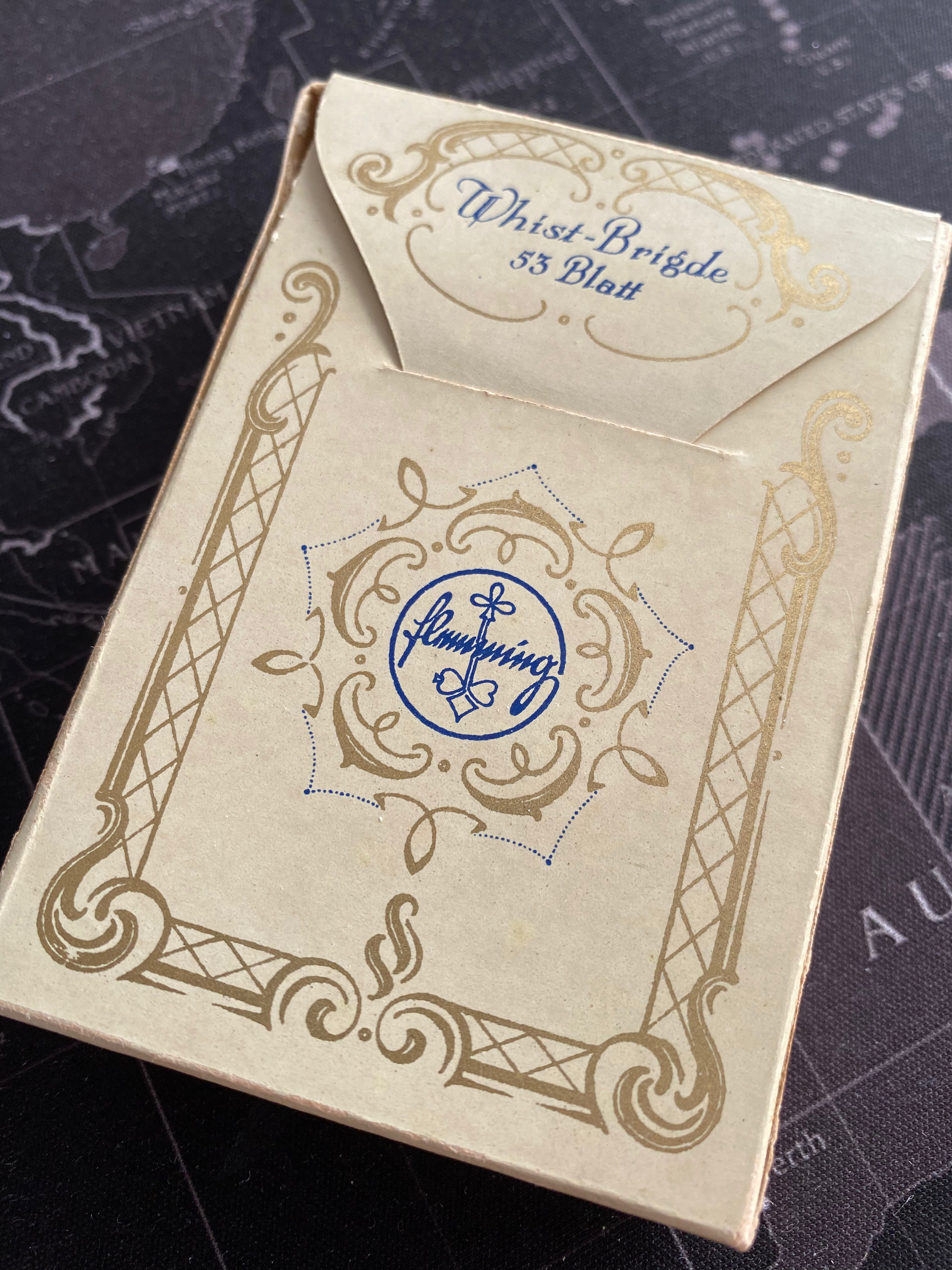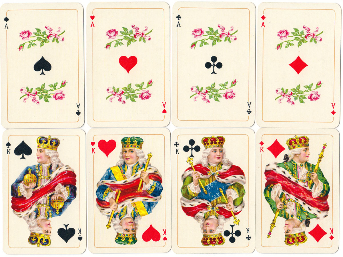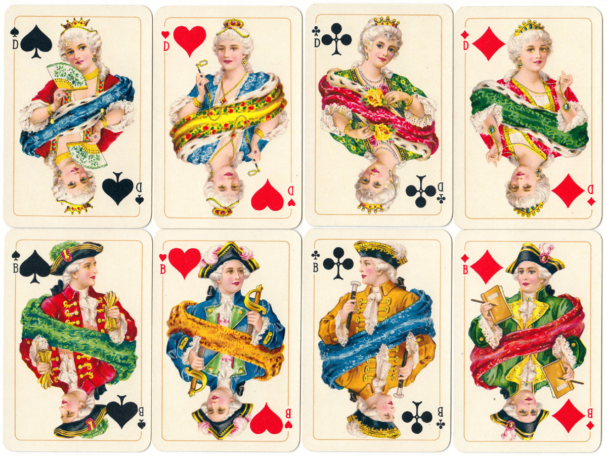 A colourful version of Rococo style playing cards printed in fine chromolithography by the factory Flemming-Wiskott A.G. of Glogau, Germany in about 1930. The company started printing playing cards in 1924 and took over the production of Dondorf playing cards in 1929, but keep printed them under the Dondorf name until 1933 when they merged with the Vereinigte Altenburger Und Stralsunder Spielkartenfabriken AG, Altenburg (VASS).
