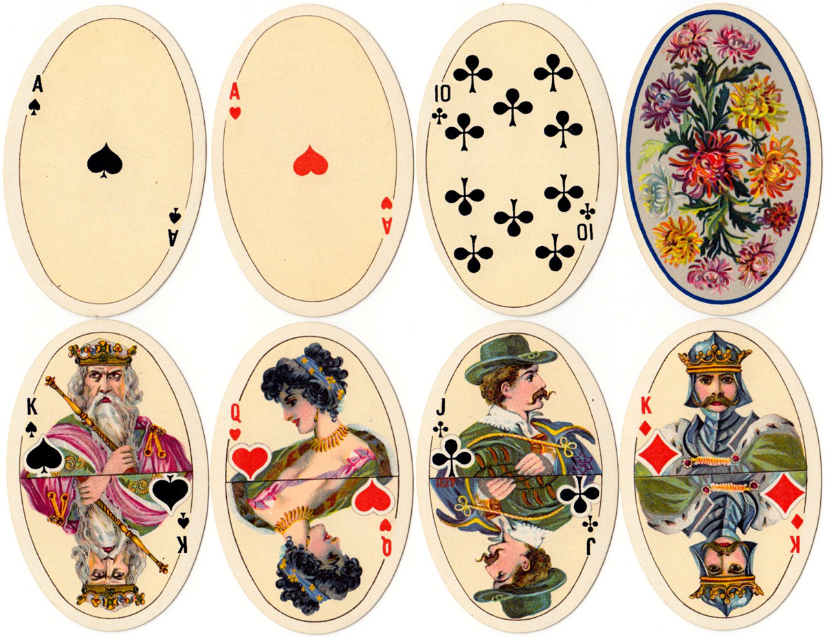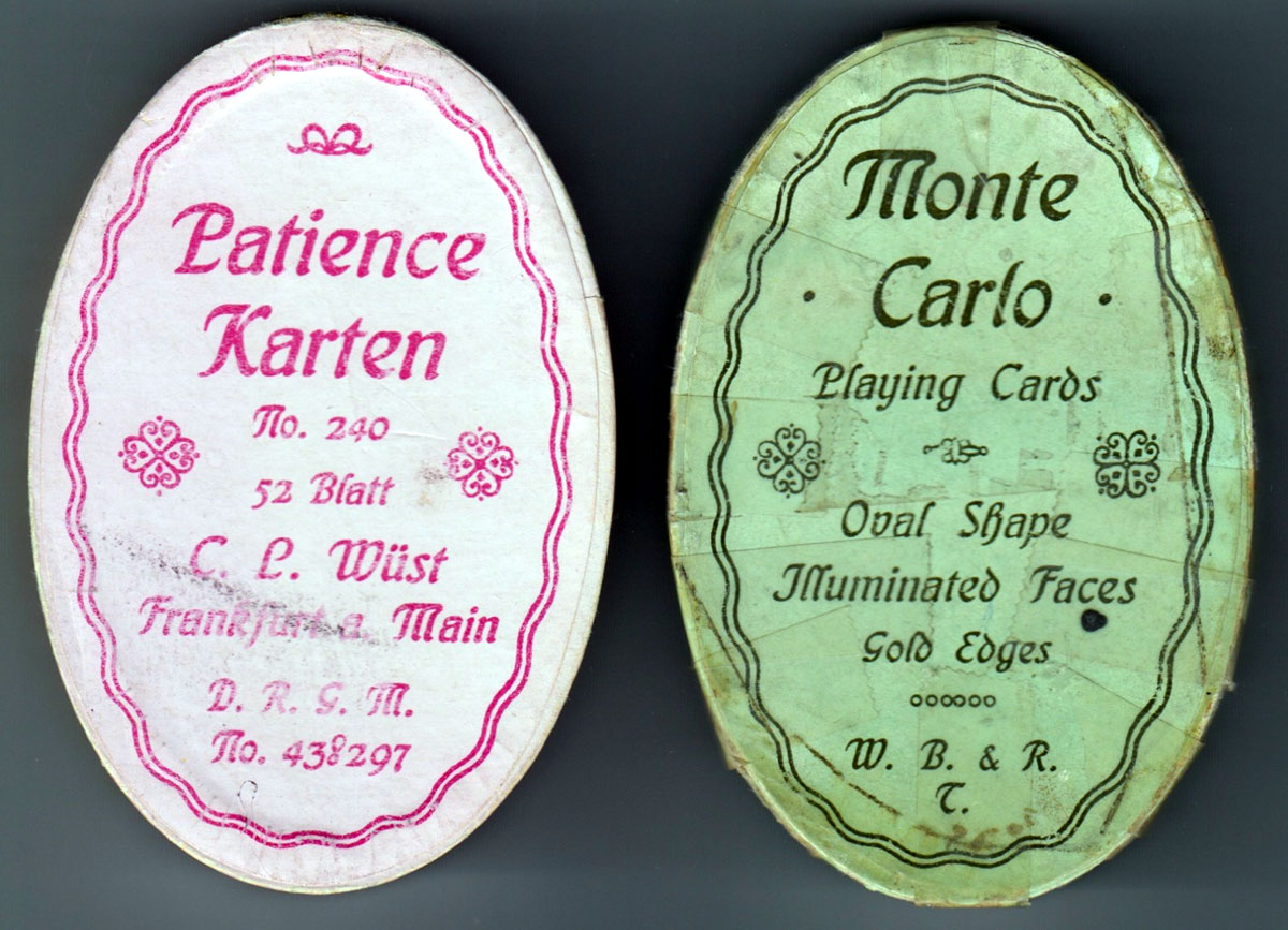 There are three known versions of these oval playing cards made by C.L. Wüst of Frankfurt between 1910 and 1918.