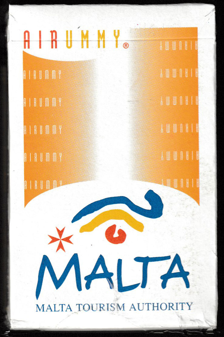 Above: souvenir pack made for the Malta Tourism Authority, c.2000. 52 cards + 4 Jokers + 4 cards with rules for AIRUMMY® in English, French, German, and Italian. Size: 57 x 89 mm. Maker unknown but probably printed locally. Purchased in Malta, 2002.